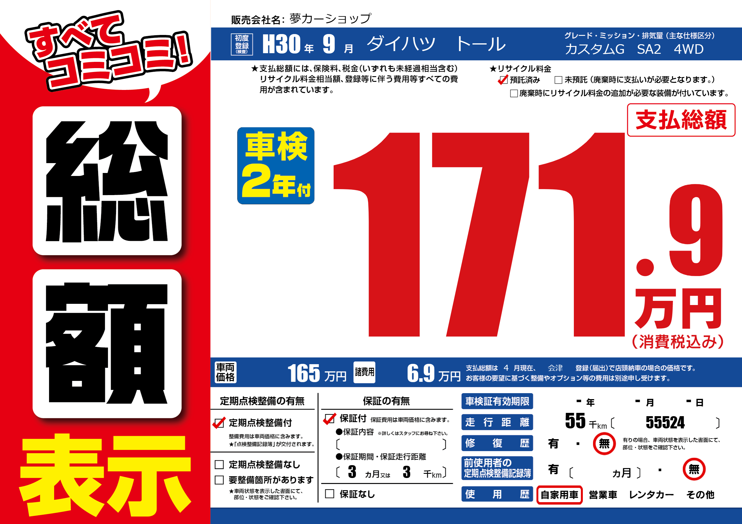 | 車名 | ダイハツ トール | グレード ミッション 排気量 |