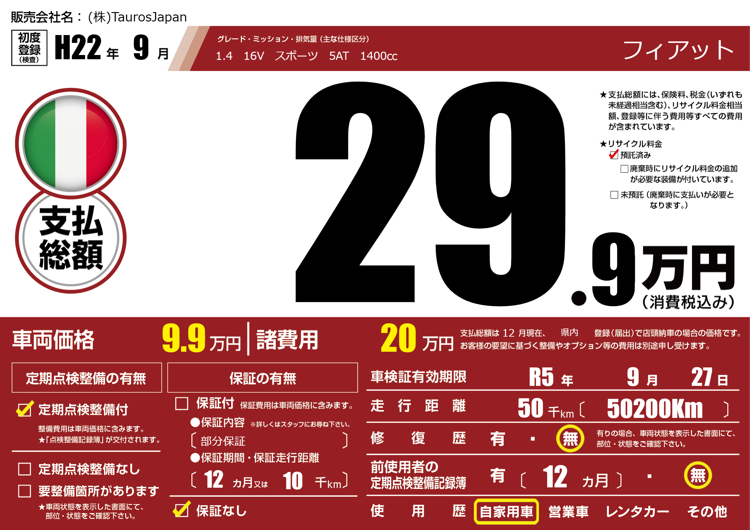 | 車名 | フィアット | グレード ミッション 排気量 |