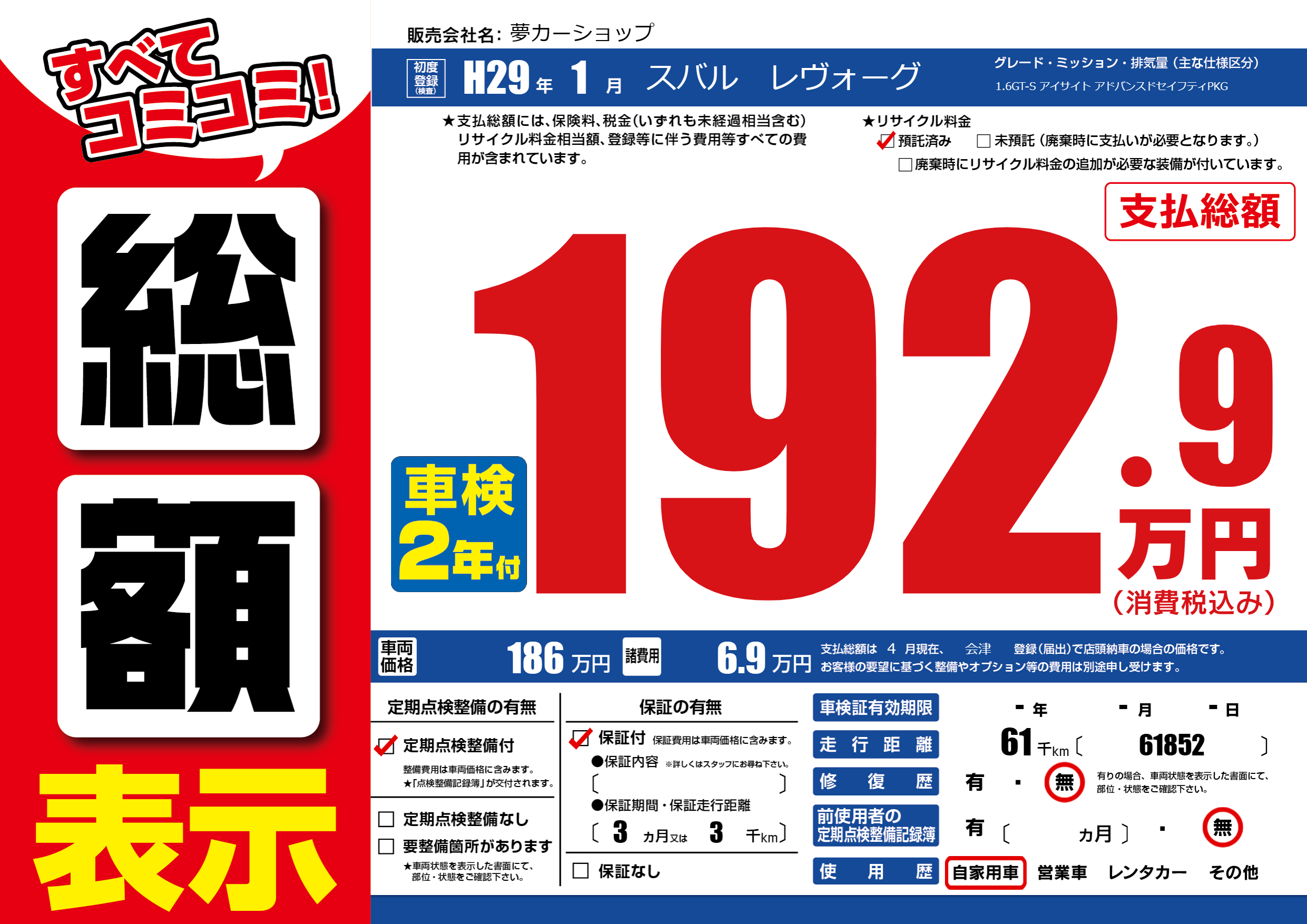 | 車名 | スバル レヴォーグ | グレード ミッション 排気量 |