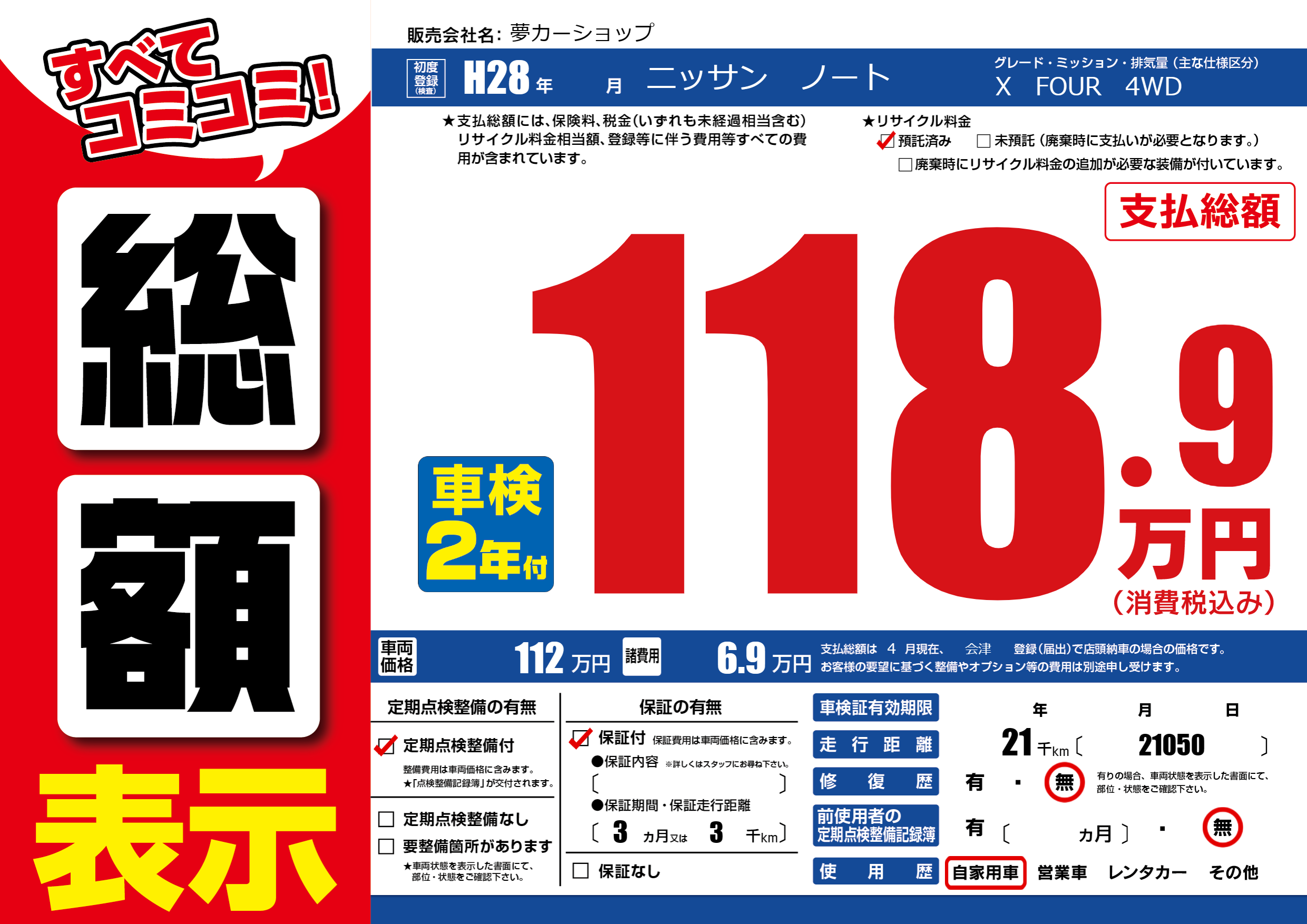 | 車名 | ニッサン ノート | グレード ミッション 排気量 |