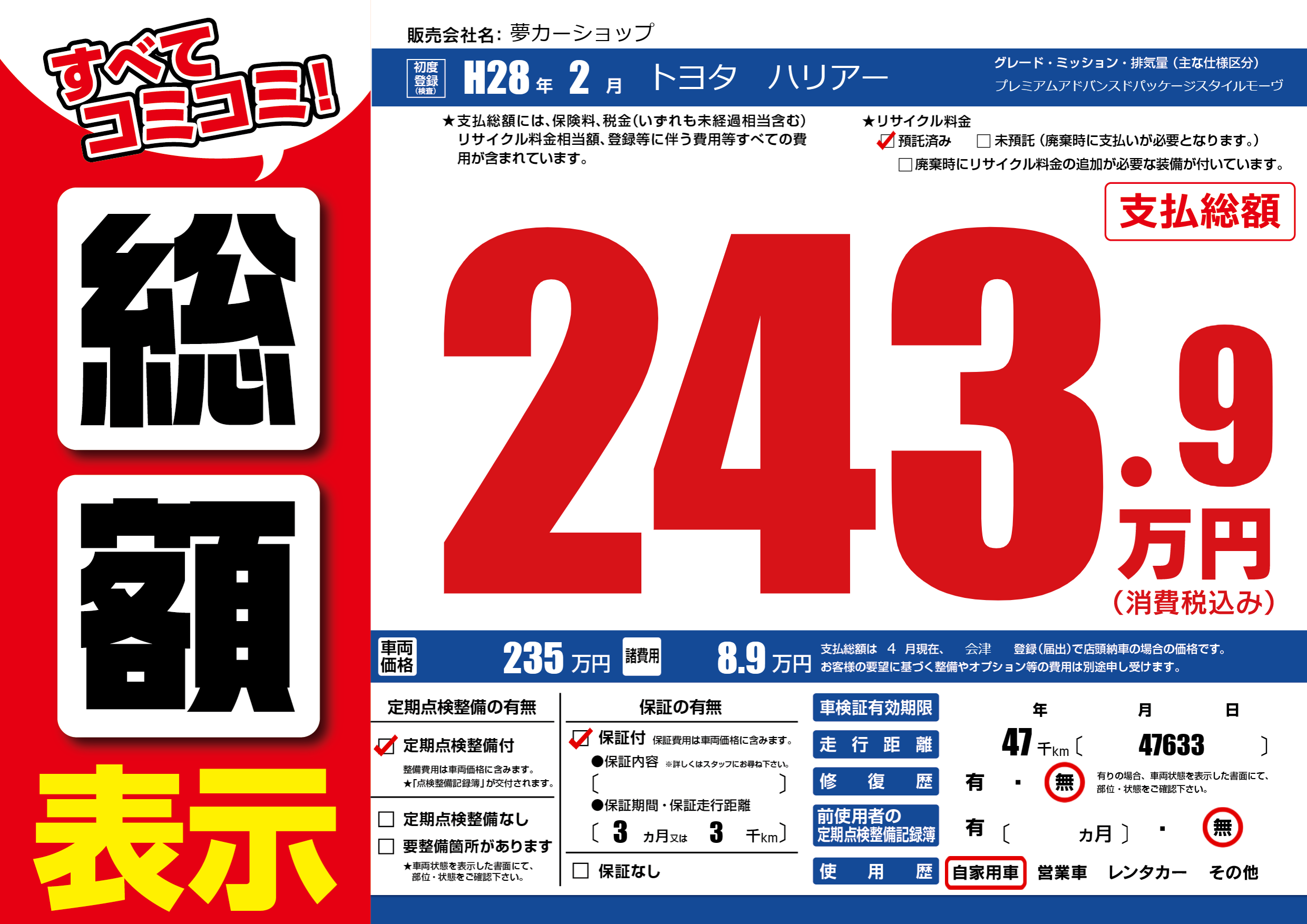 | 走行キロ | 4.7万km | 初年度登録 | H28年2月 |