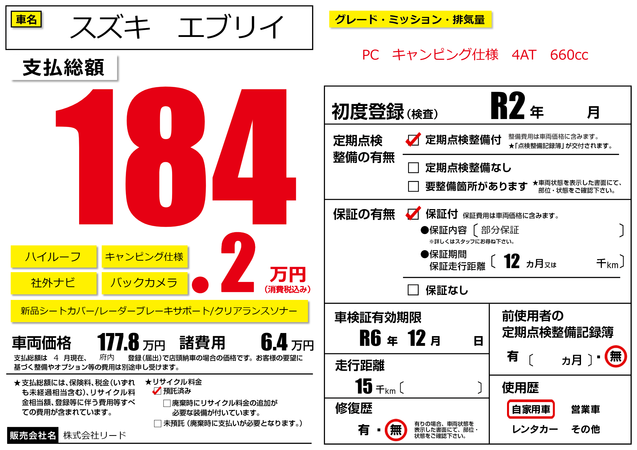 なし | 車検制限 | R6年12月---月 |