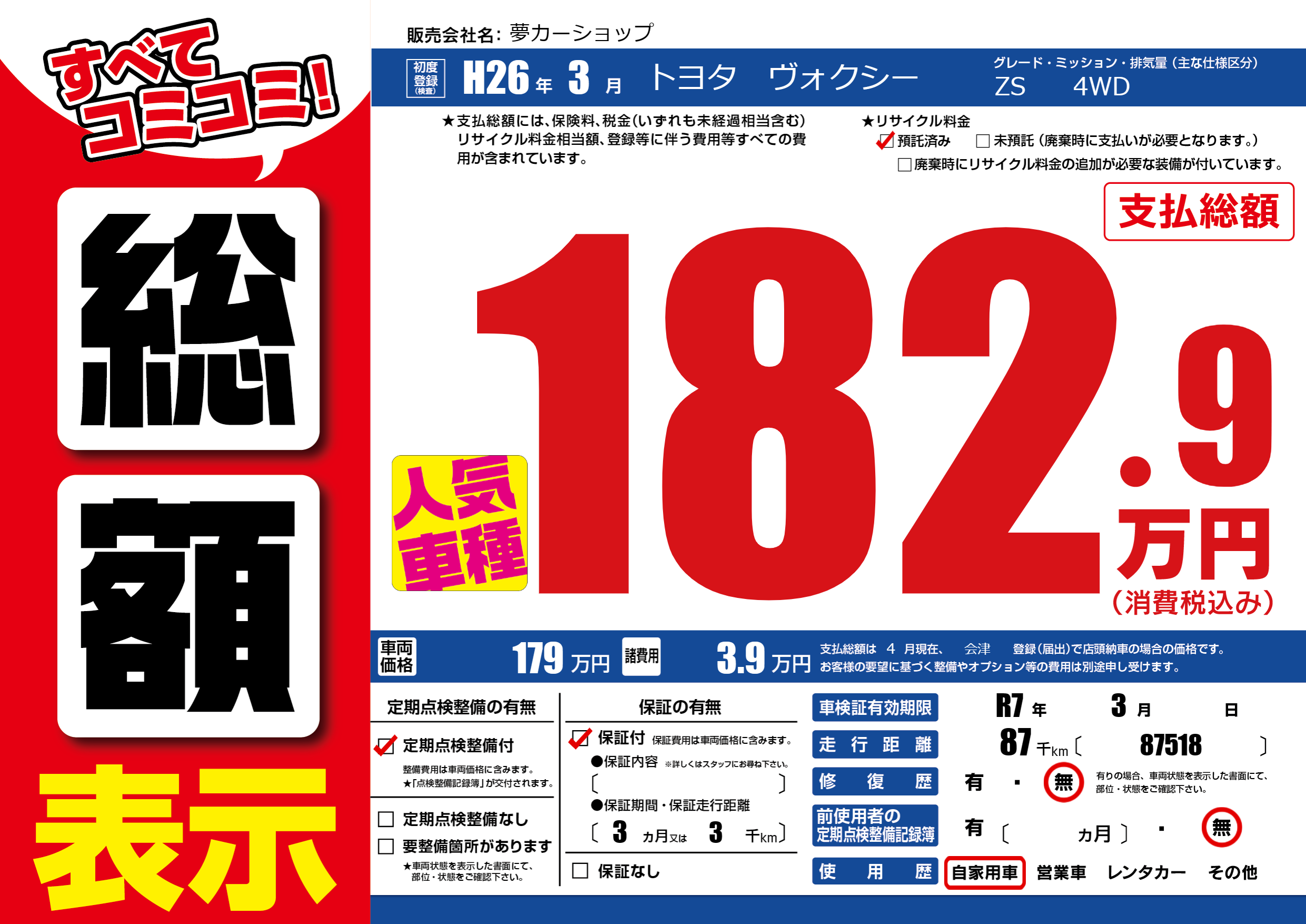 | 車名 | トヨタ ヴォクシー | グレード ミッション 排気量 |