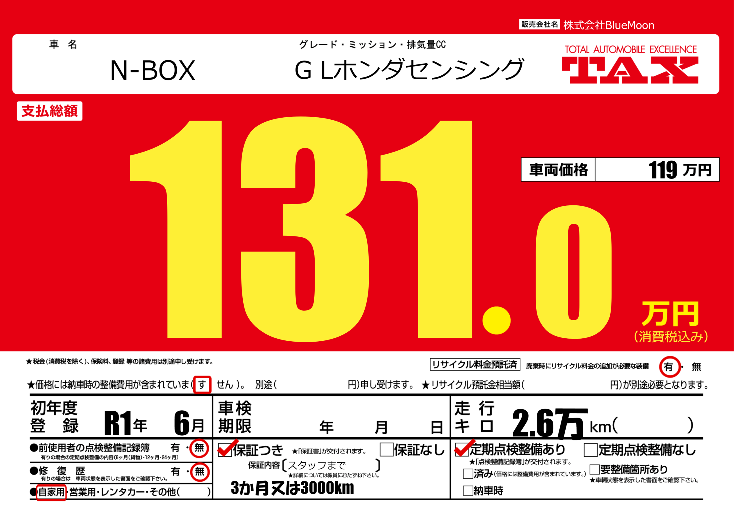 | 車名 | N-BOX | グレード ミッション 排気量 |