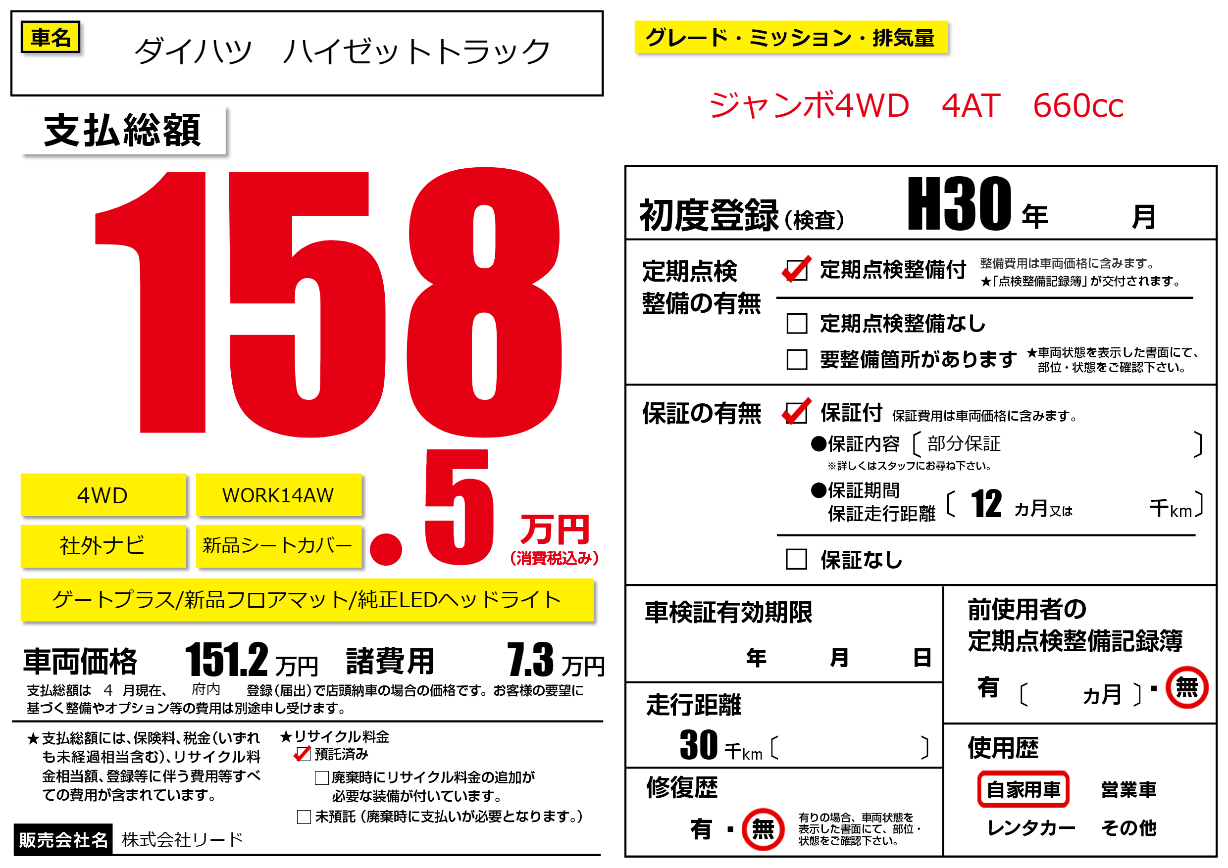 | 走行キロ | 3万km | 初年度登録 | H30年---月 |