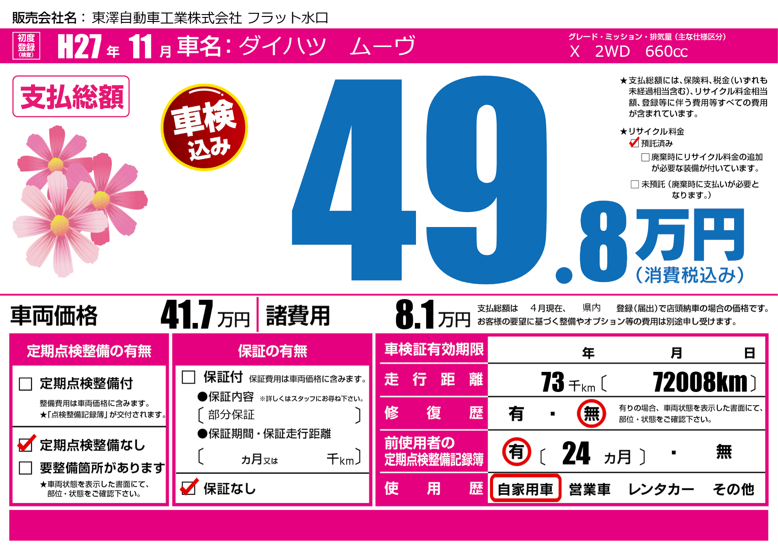 | 車名 | ダイハツ ムーヴ | グレード ミッション 排気量 |
