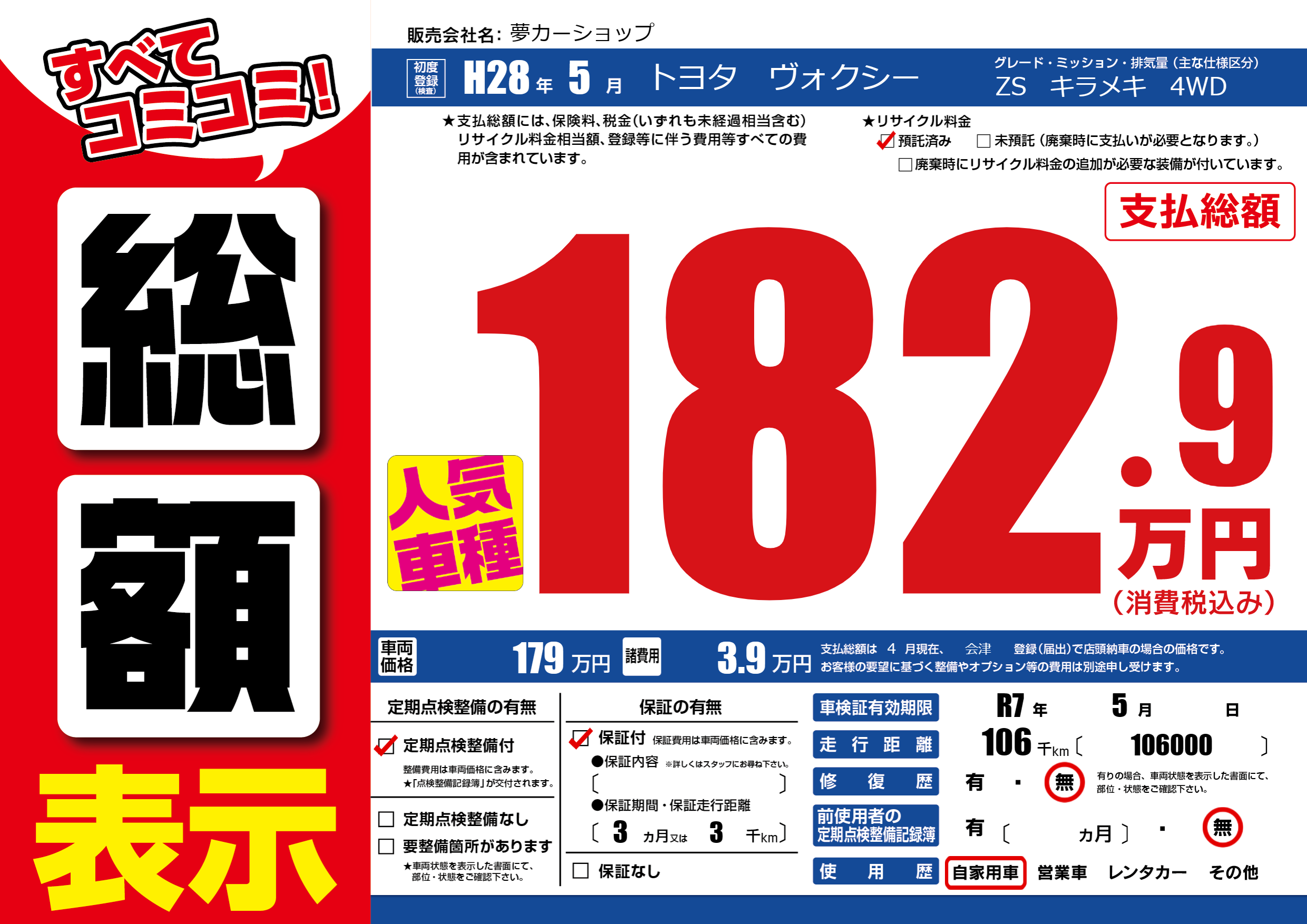 | 車名 | トヨタ ヴォクシー | グレード ミッション 排気量 |