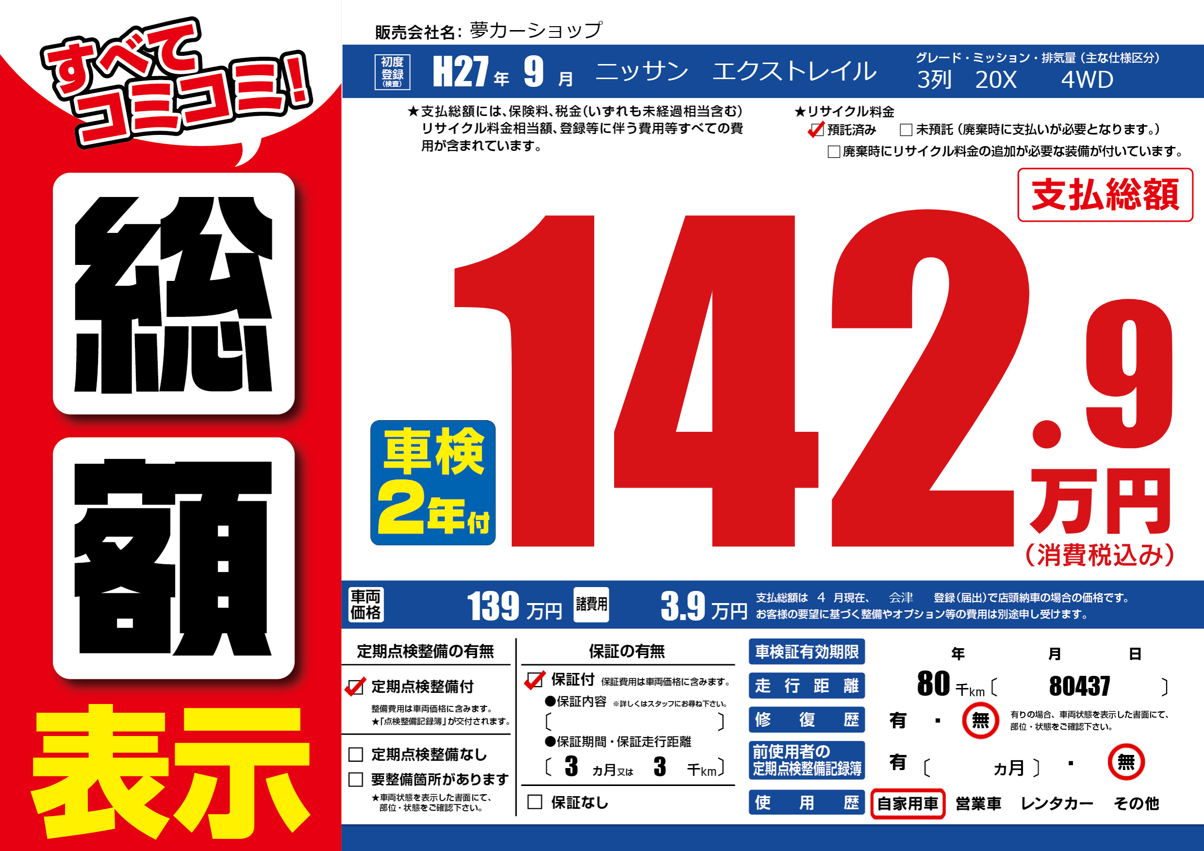 | 走行キロ | 8万km | 初年度登録 | H27年9月 |
