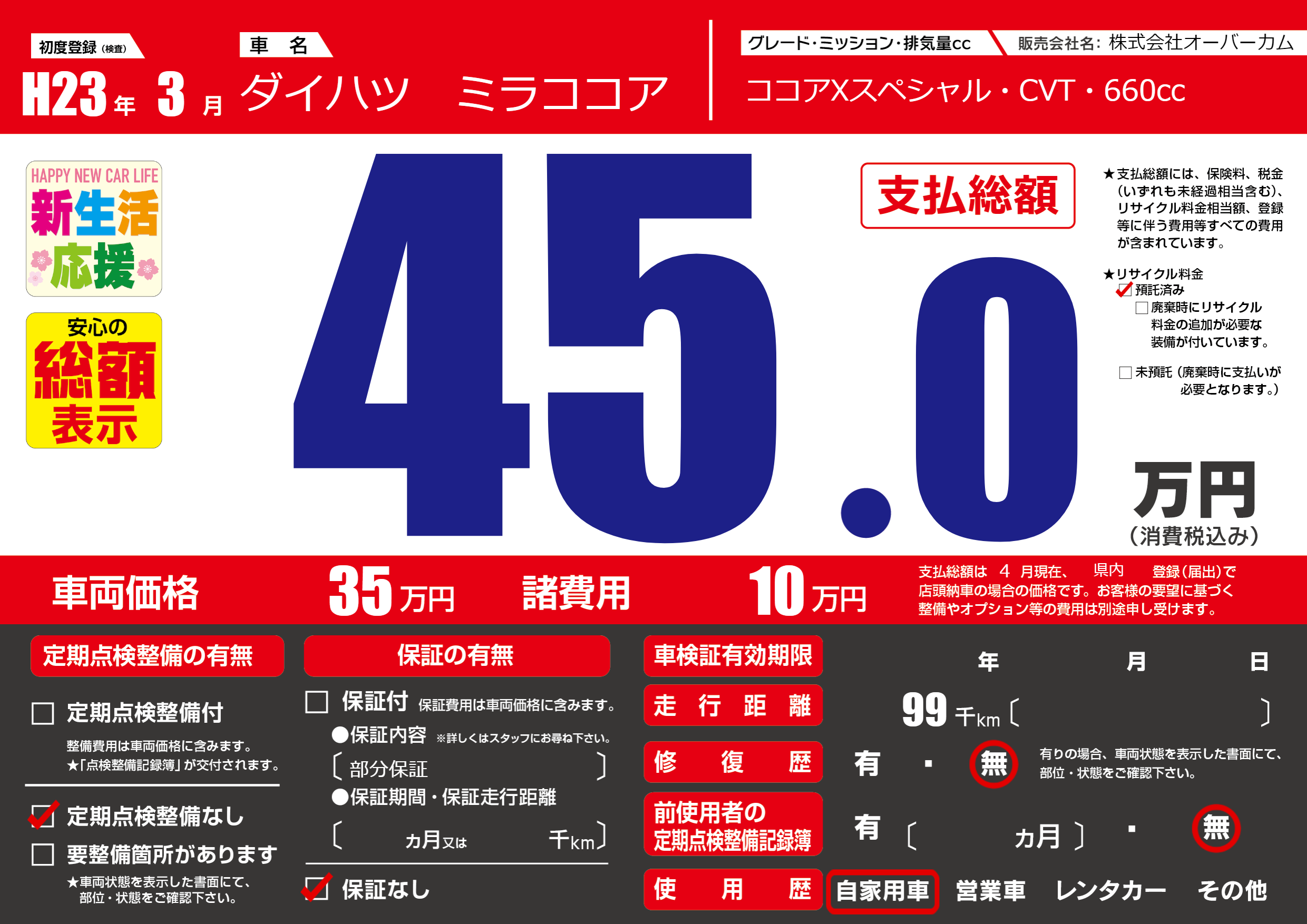 | 車名 | ダイハツ ミラココア | グレード ミッション 排気量 |