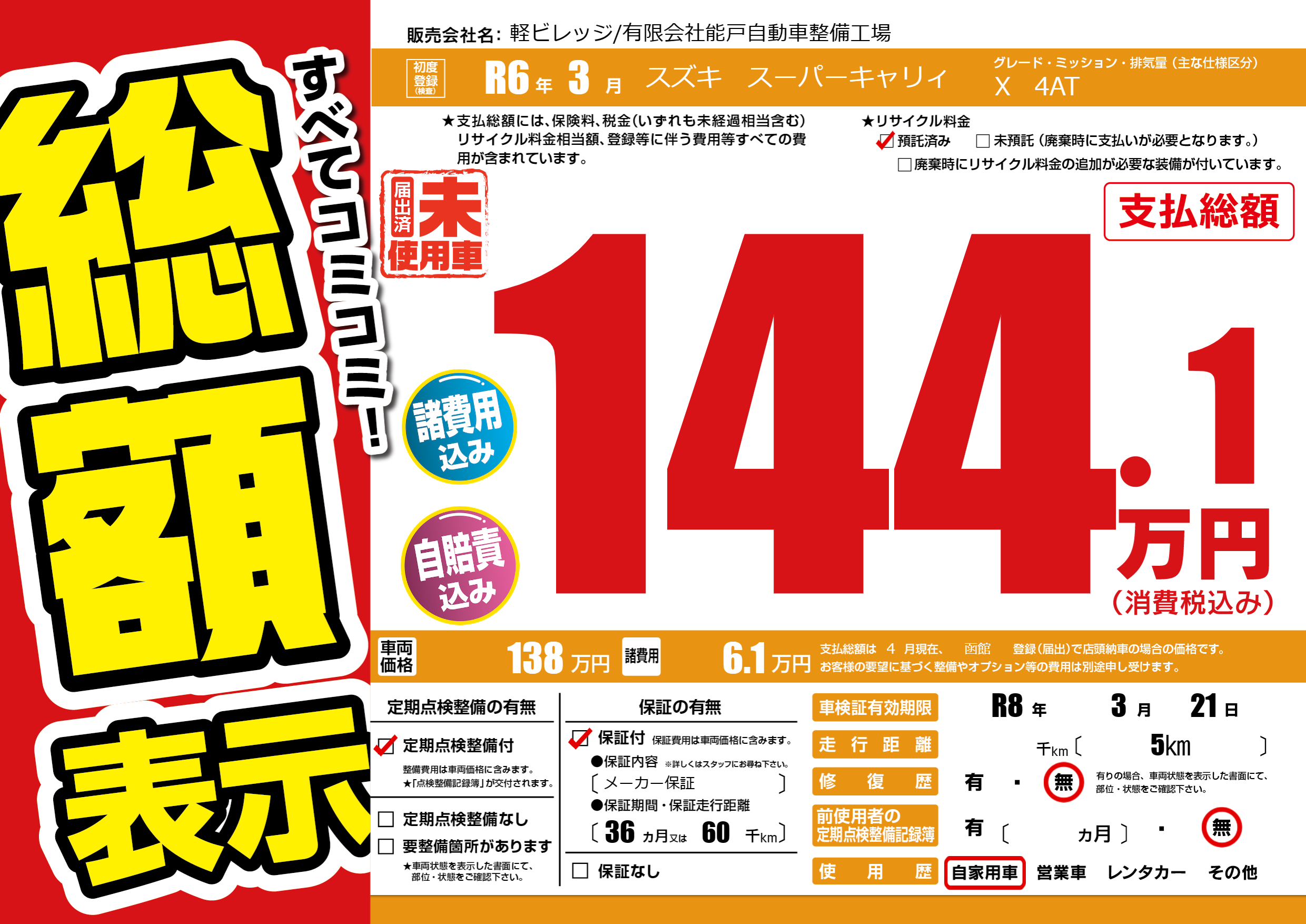| 車名 | スズキ スーパーキャリィ | グレード ミッション 排気量 |