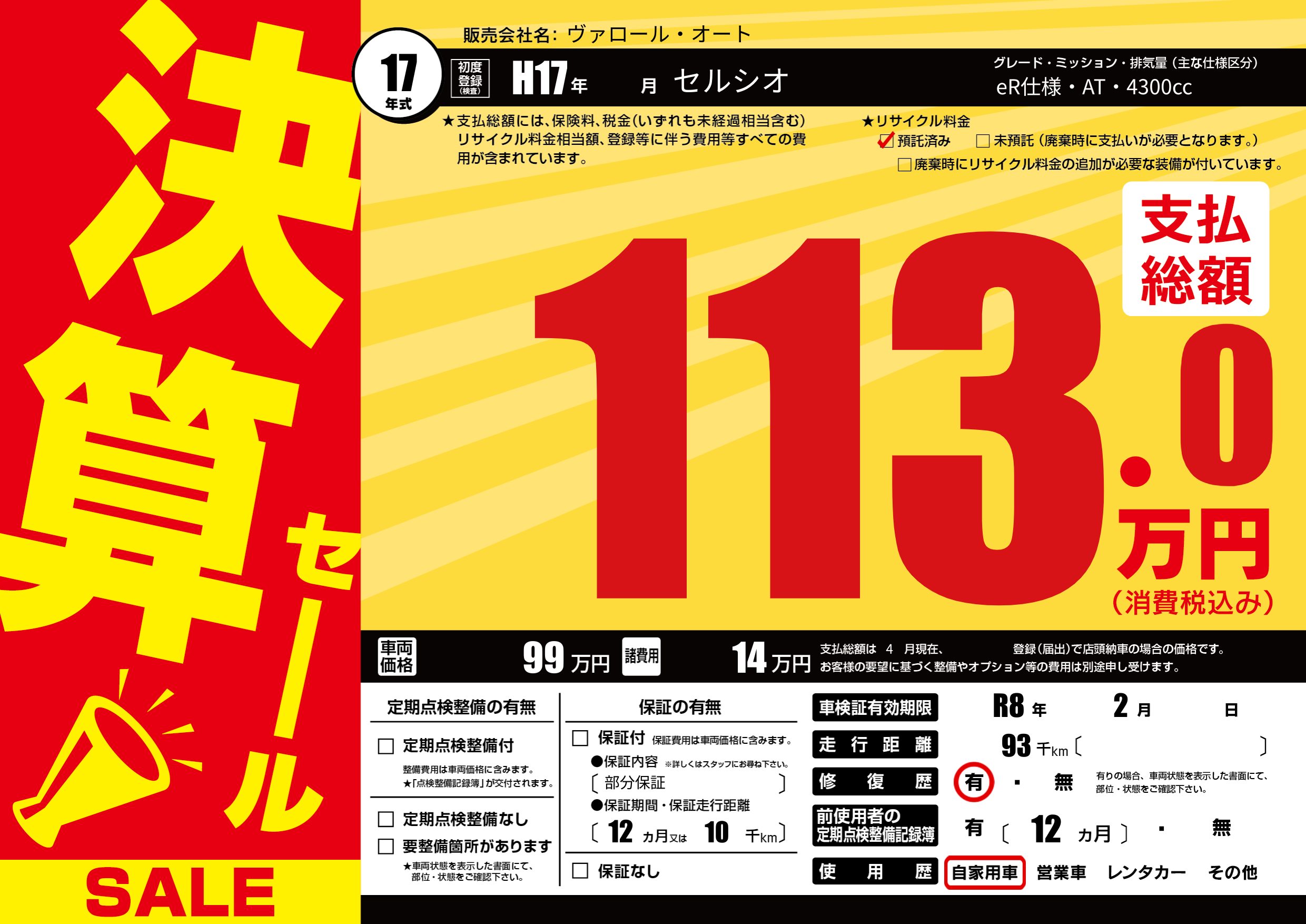 | 車検制限 | R8年 2月 - 日 | ||