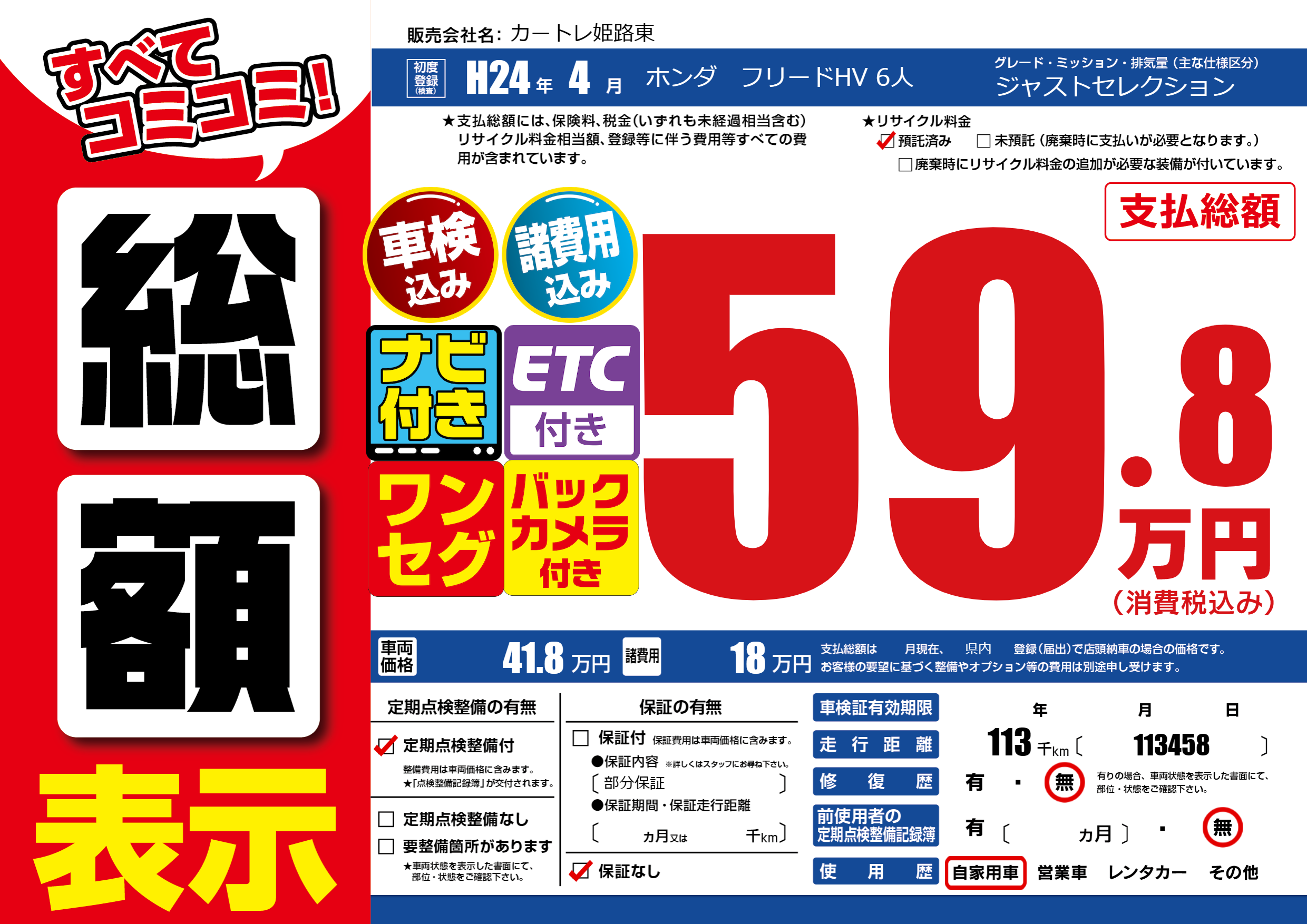 | 車名 | ホンダ フリードHV 6人 | グレード ミッション 排気量 |