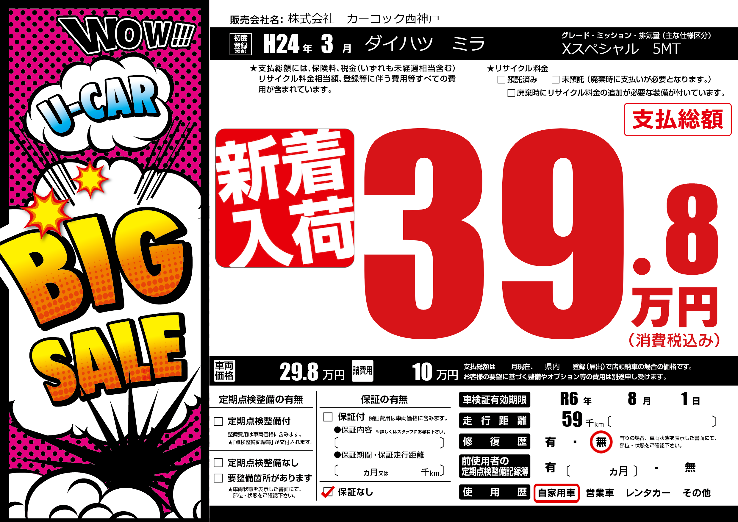 | 走行キロ | 5.9万km | 初年度登録 | H24年3月 |