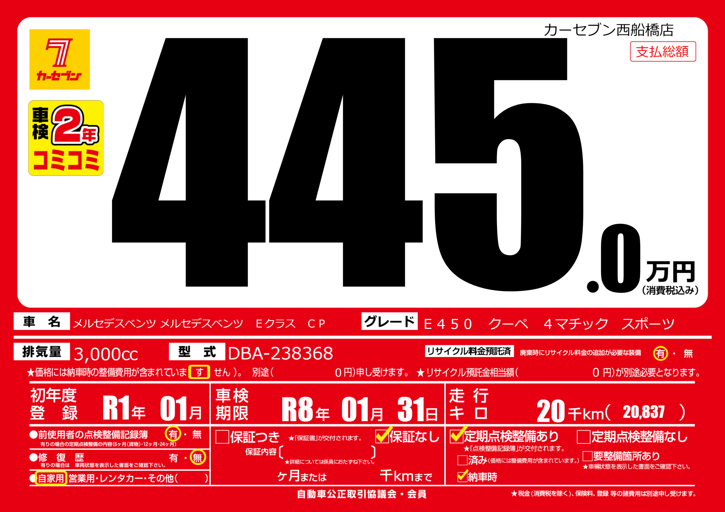 | 車名 | メルセデスベンツ メルセデスベンツ Eクラス CP | グレード ミッション 排気量 |