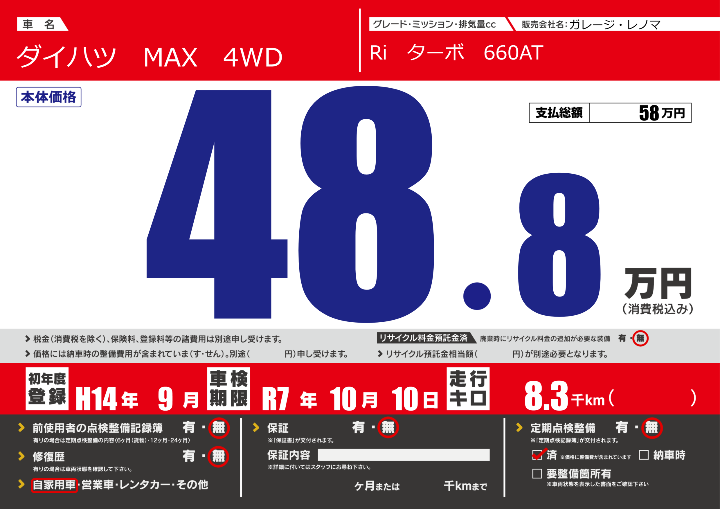 | 車名 | ダイハツ MAX 4WD | グレード ミッション 排気量 |