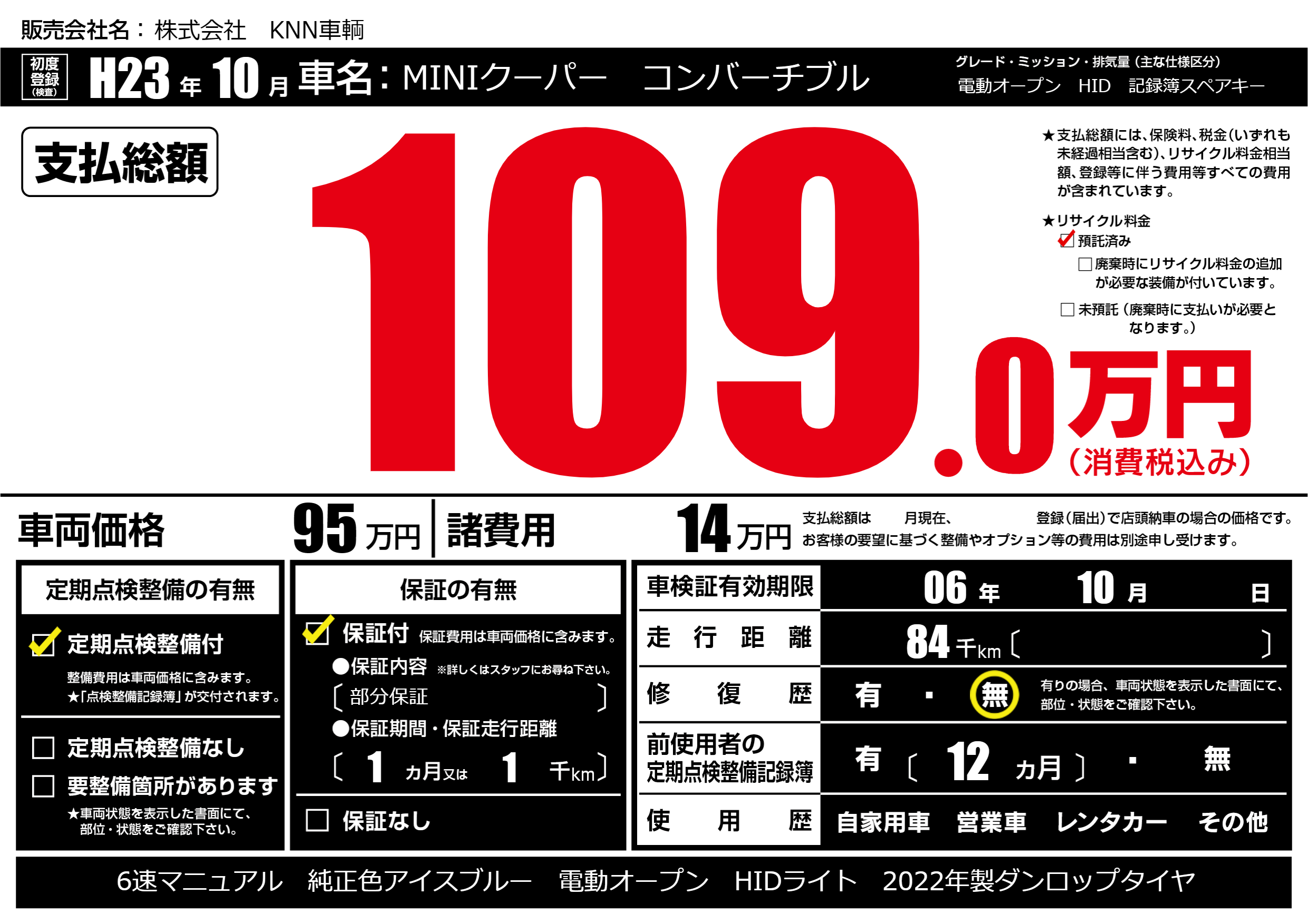 | 車名 | MINIクーパー コンバーチブル | グレード ミッション 排気量 |