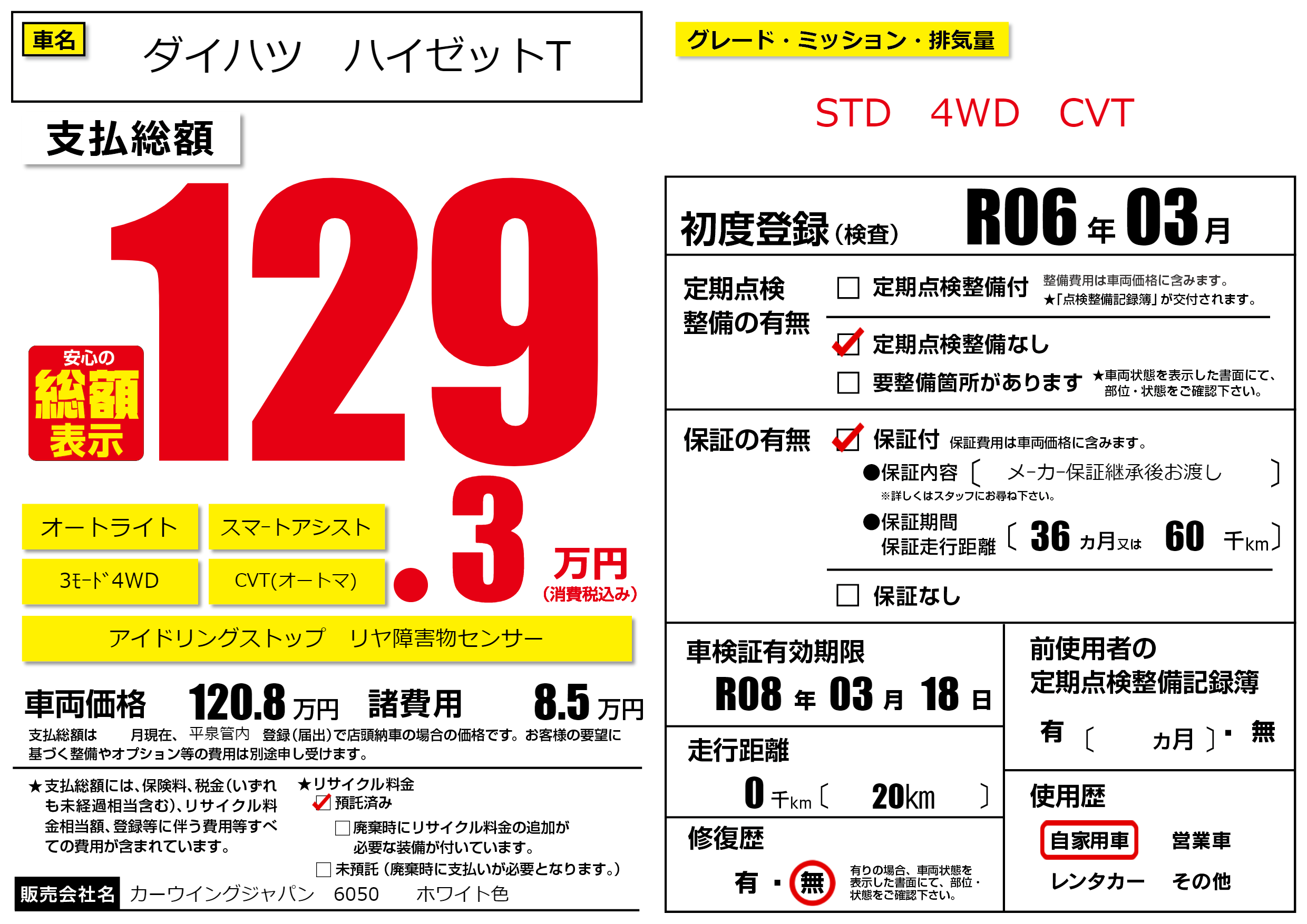 | 車名 | ダイハツ ハイゼットT | グレード ミッション 排気量 |