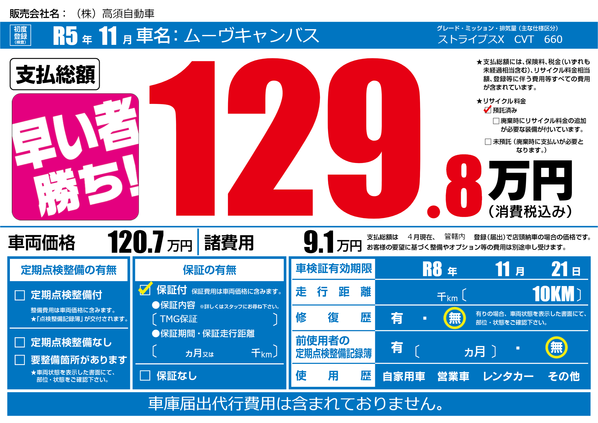 | 車名 | ムーヴキャンバス | グレード ミッション 排気量 |