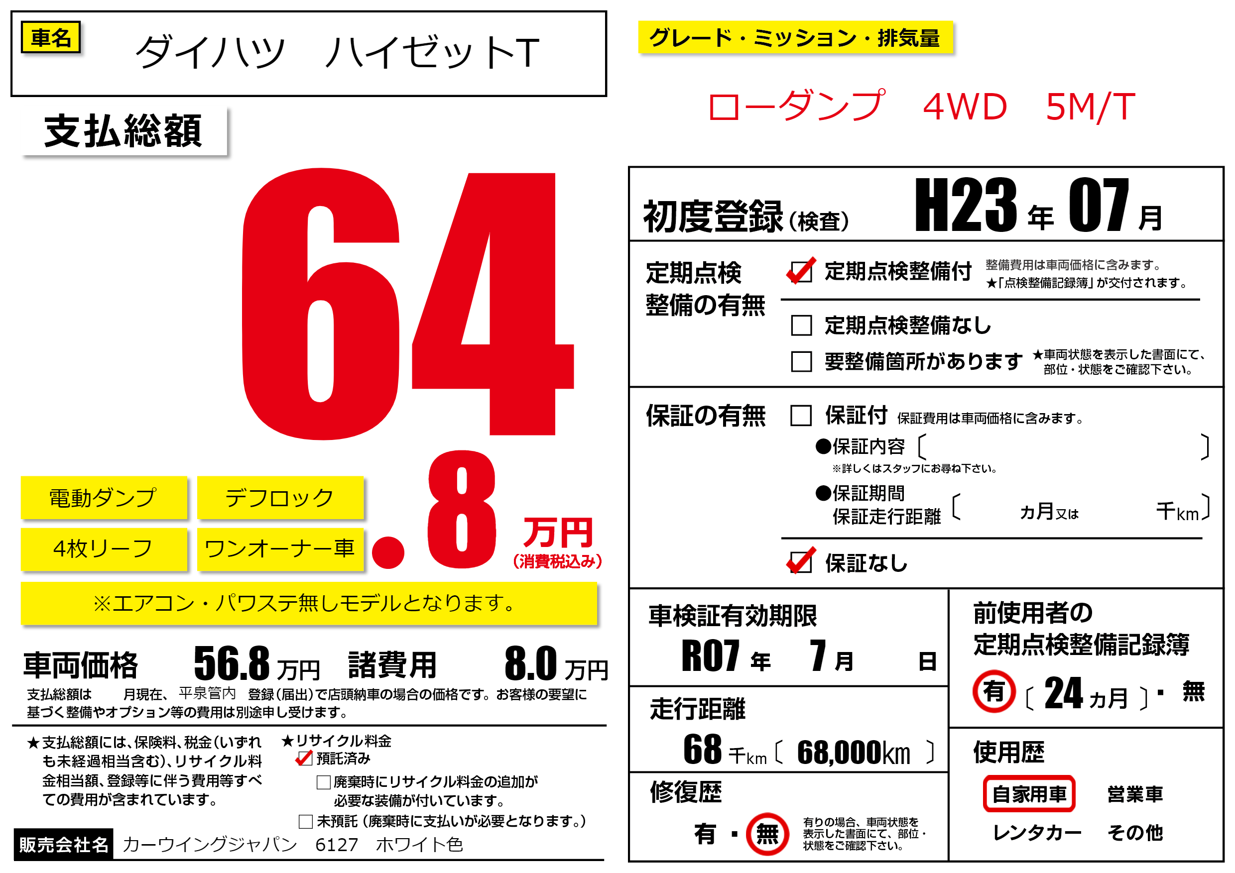 | 車名 | ダイハツ ハイゼットT | グレード ミッション 排気量 |