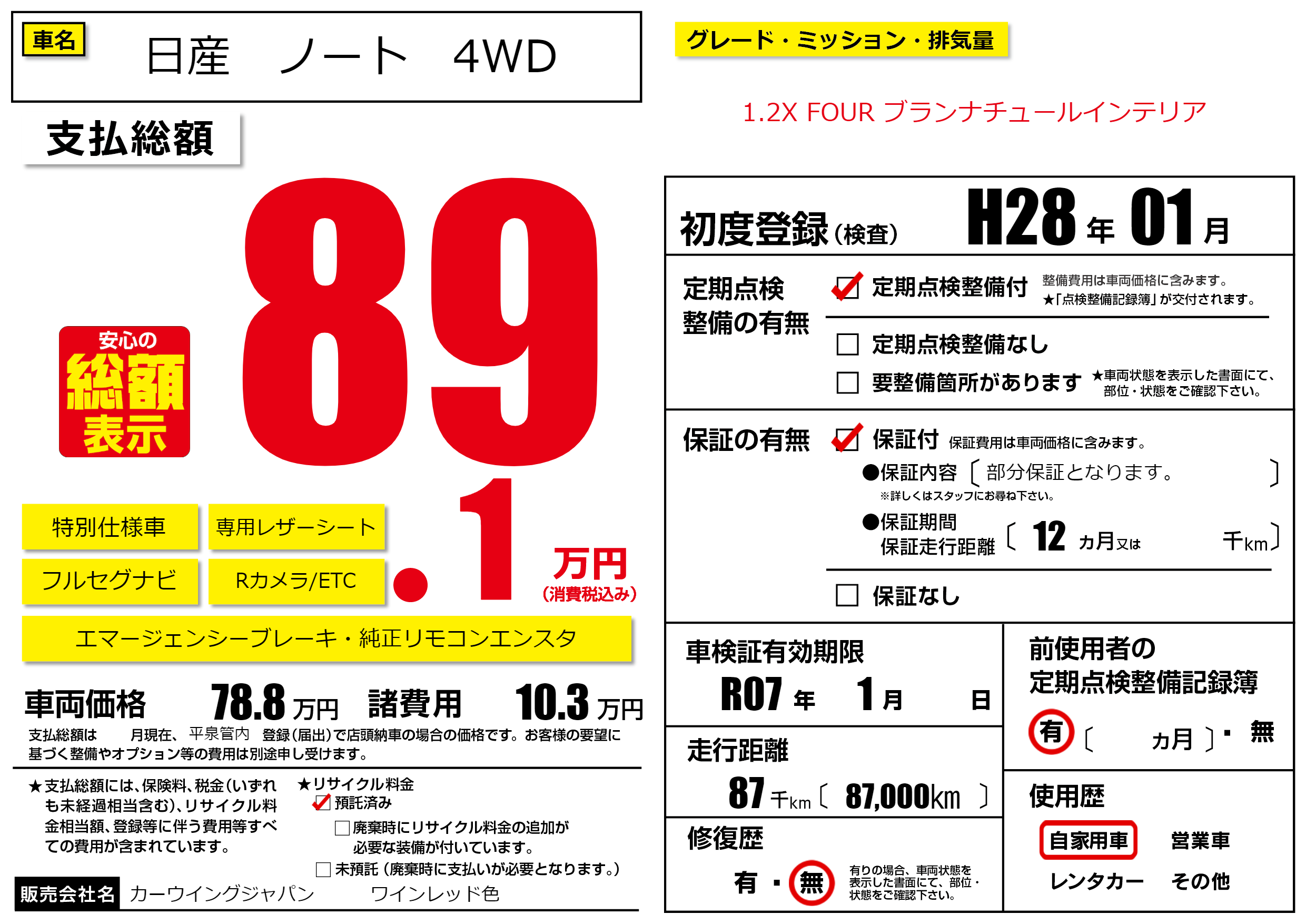 | 車名 | 日産 ノート 4WD | グレード ミッション 排気量 |