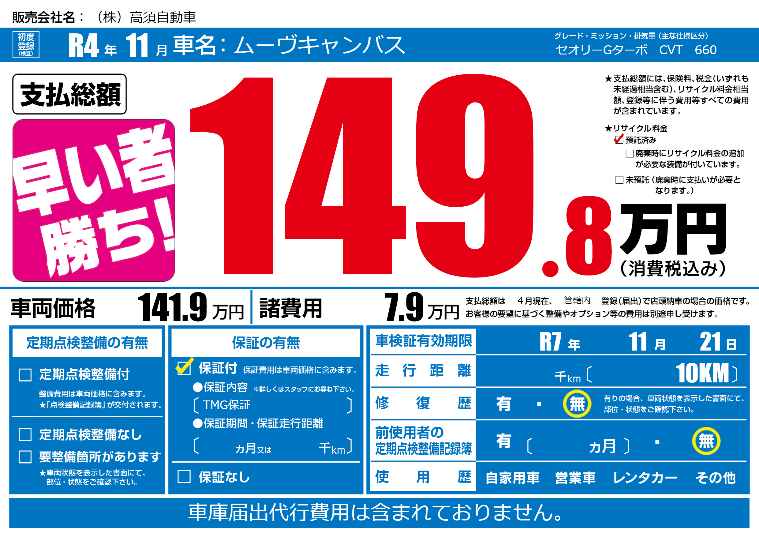 | 車名 | ムーヴキャンバス | グレード ミッション 排気量 |