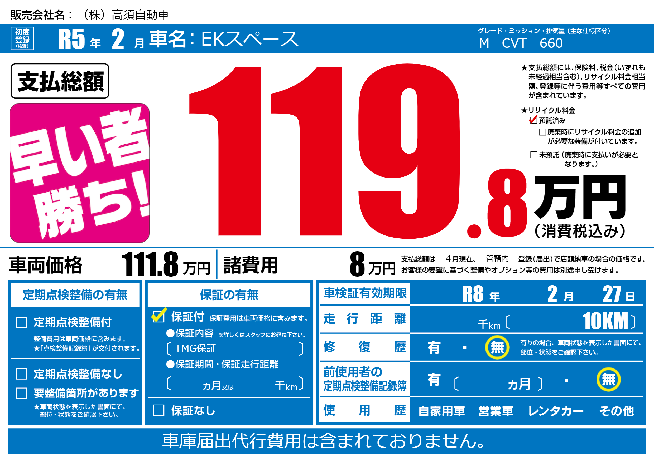 | 車名 | EKスペース | グレード ミッション 排気量 |