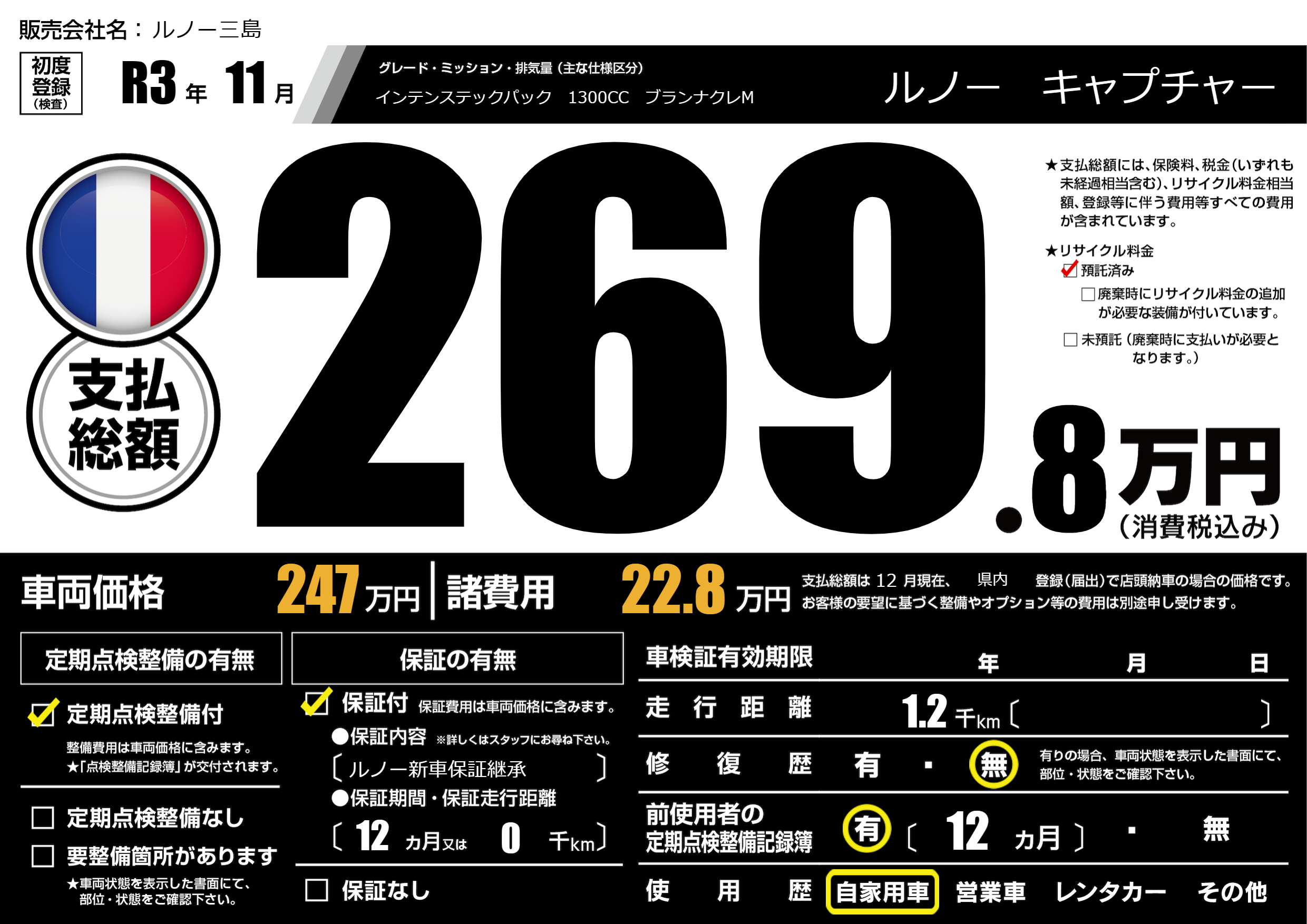 | 車名 | ルノー キャプチャー | グレード ミッション 排気量 |