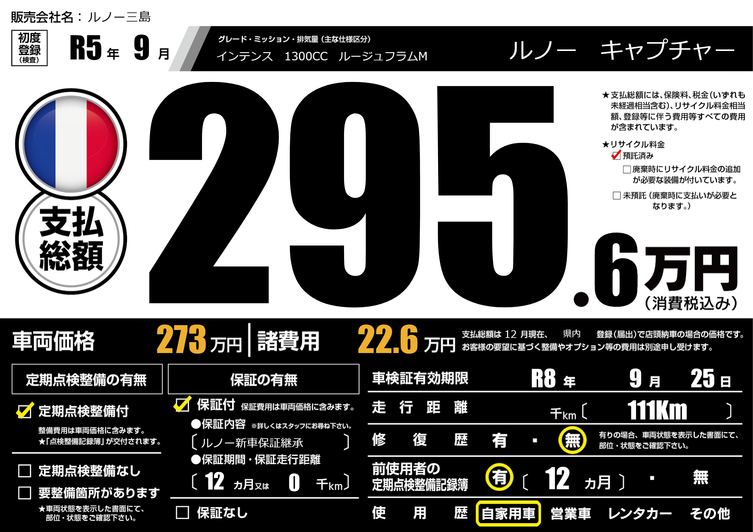 保証なし 保証内容(ルノー新車保証継承) 12ヶ月または(0)千kmまで |