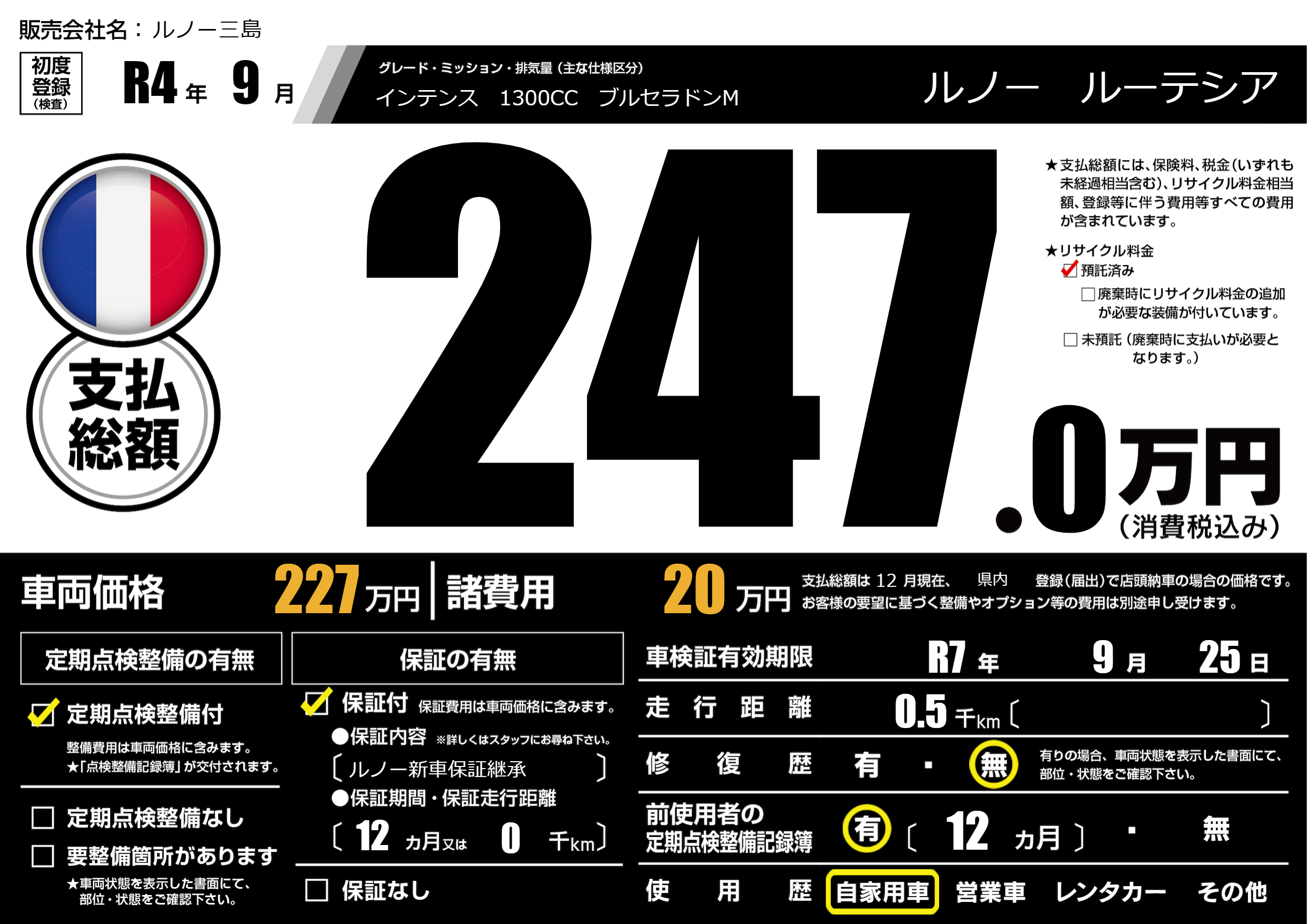 | 車名 | ルノー ルーテシア | グレード ミッション 排気量 |