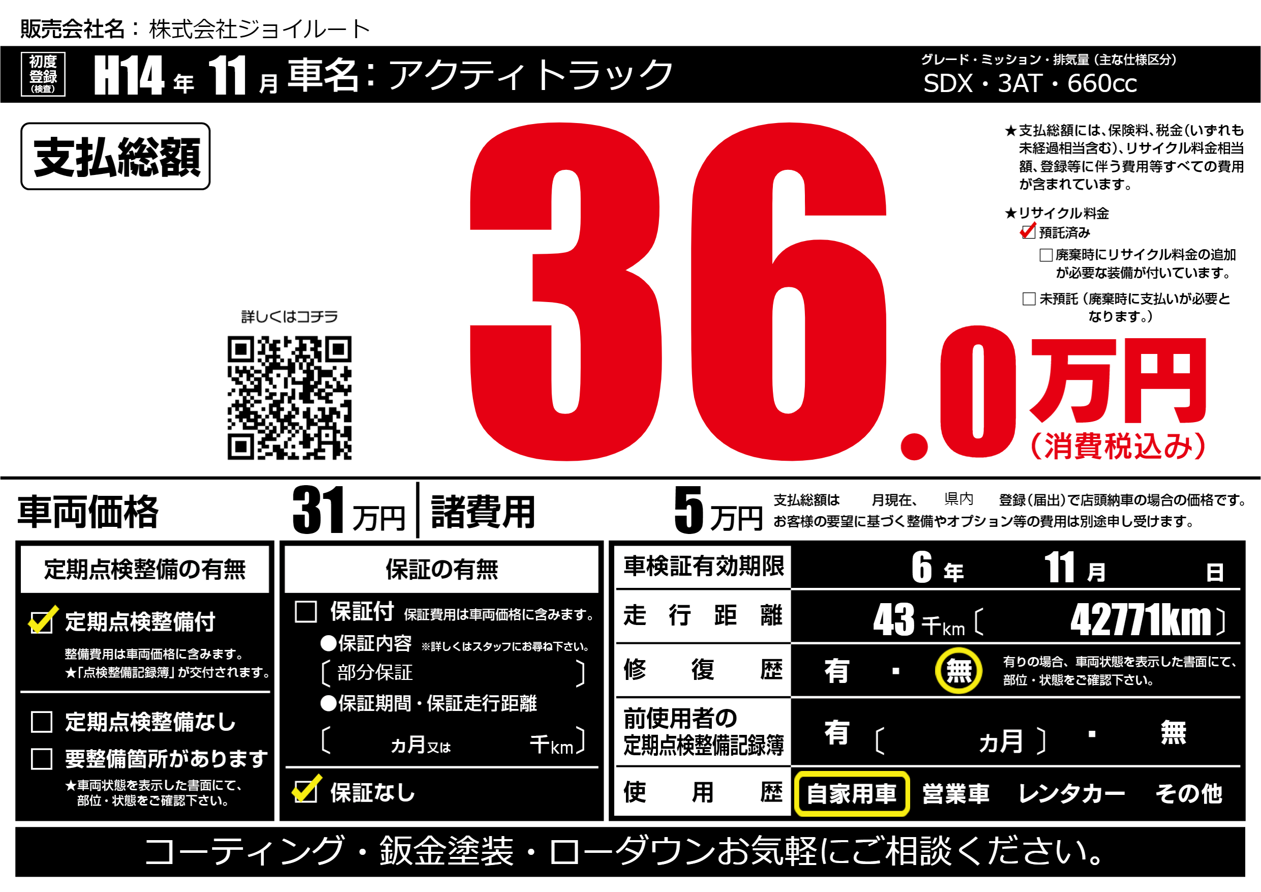 | 車名 | アクティトラック | グレード ミッション 排気量 |