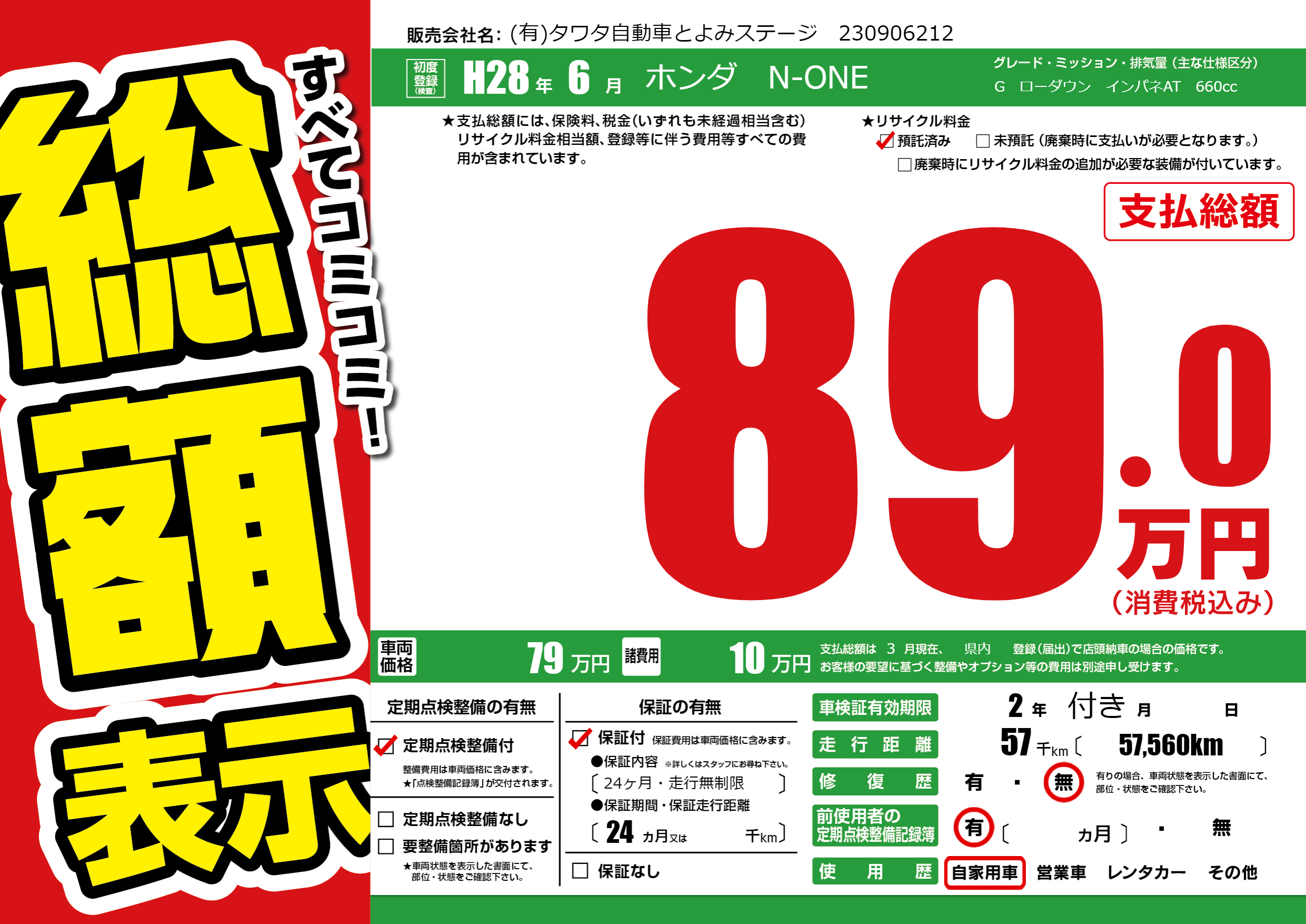 | 車名 | ホンダ N-ONE | グレード ミッション 排気量 |