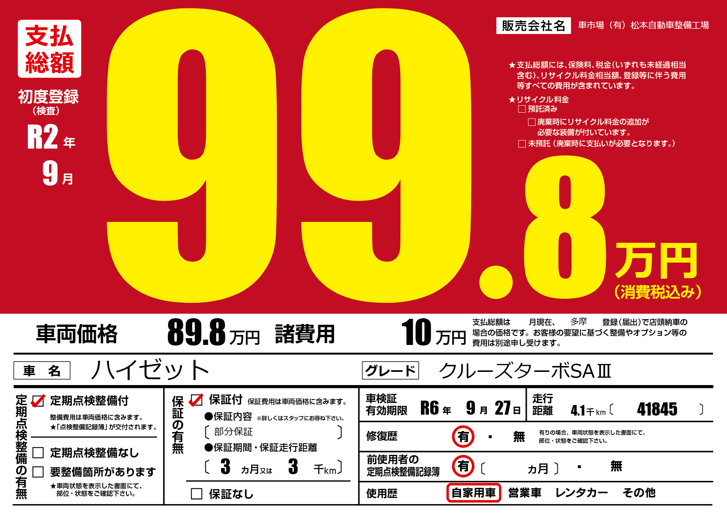 | 車名 | ハイゼット | グレード ミッション 排気量 |