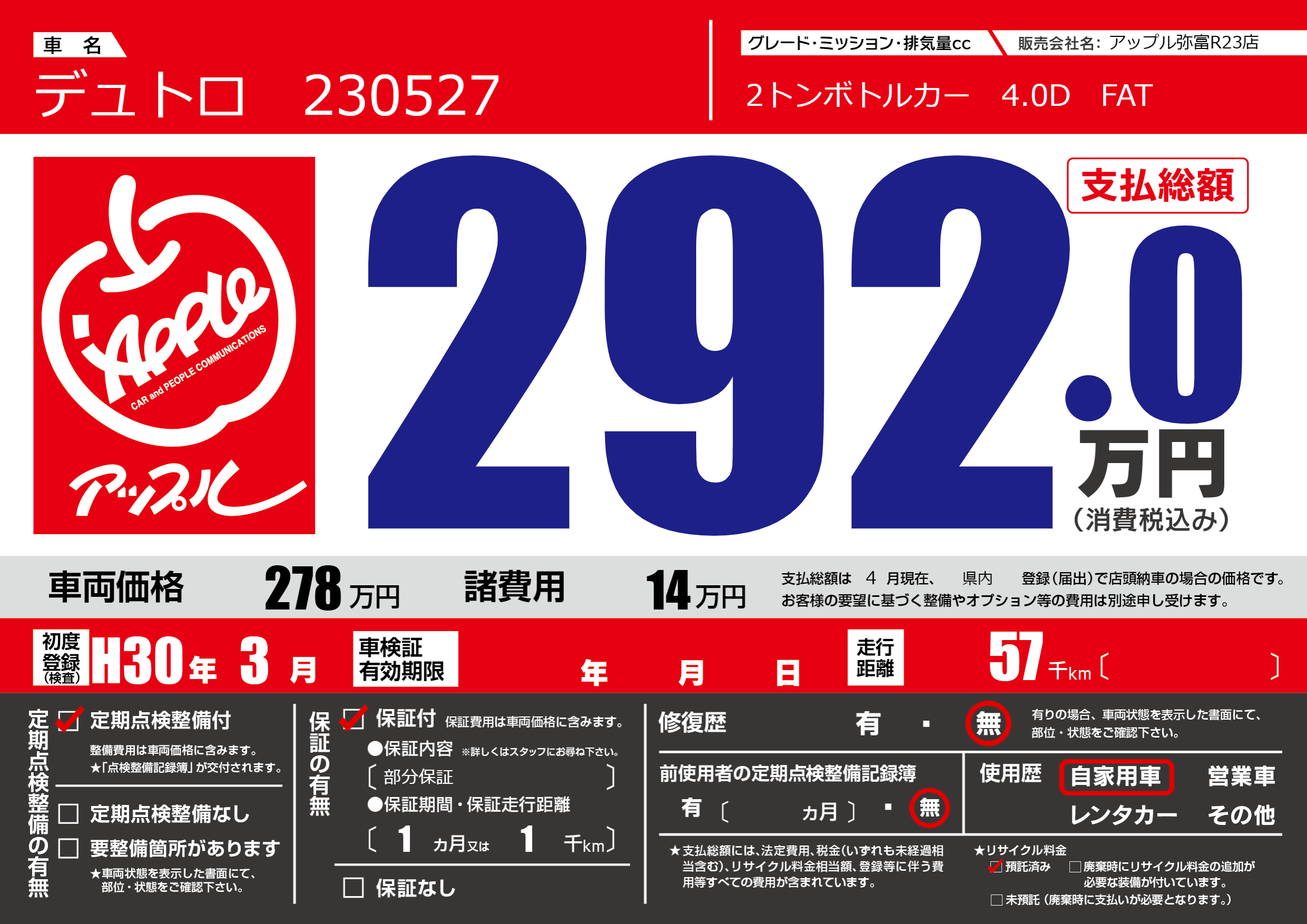 | 車名 | デュトロ 230527 | グレード ミッション 排気量 |