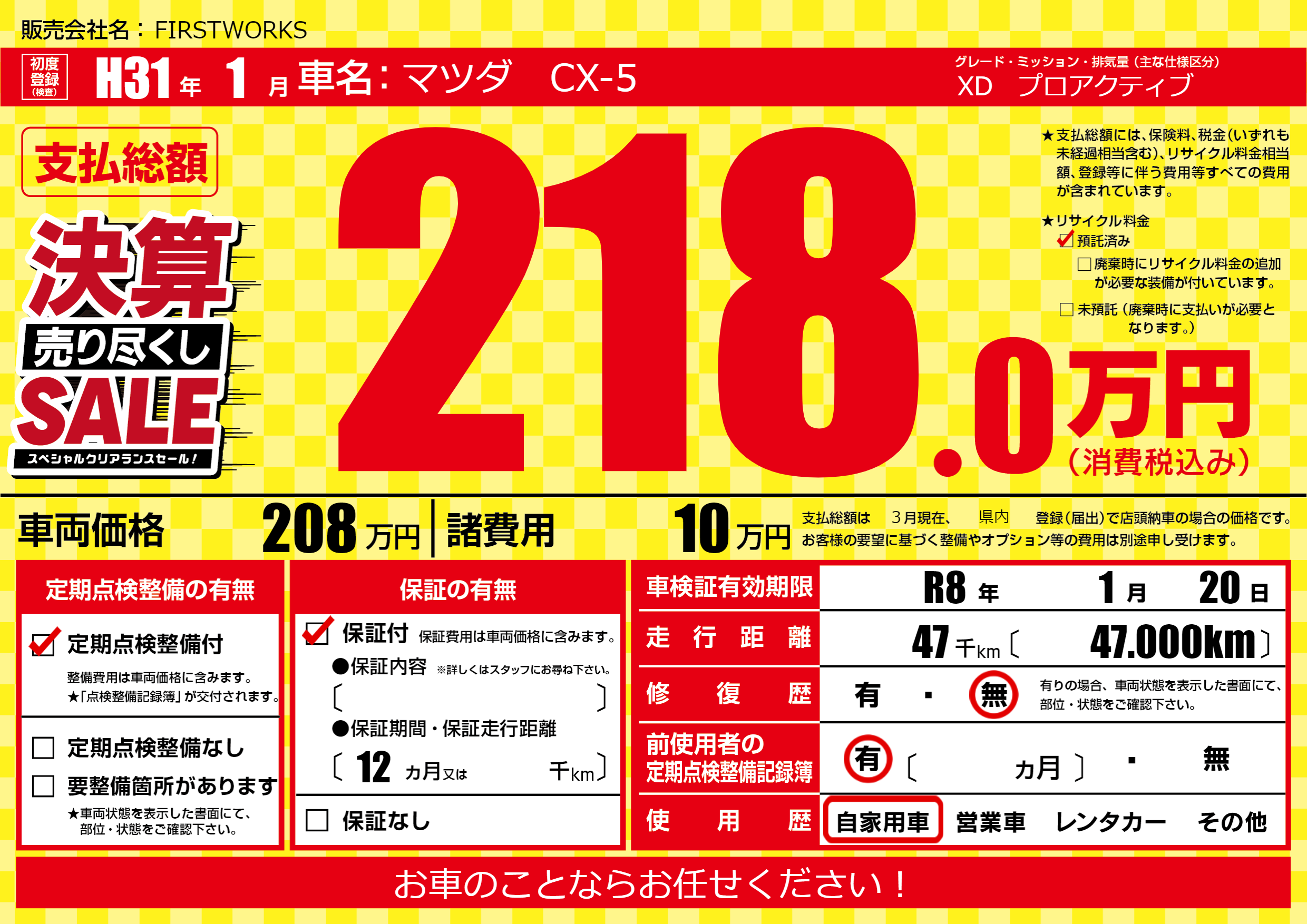 | 走行キロ | 4.7万km | 初年度登録 | H31年1月 |