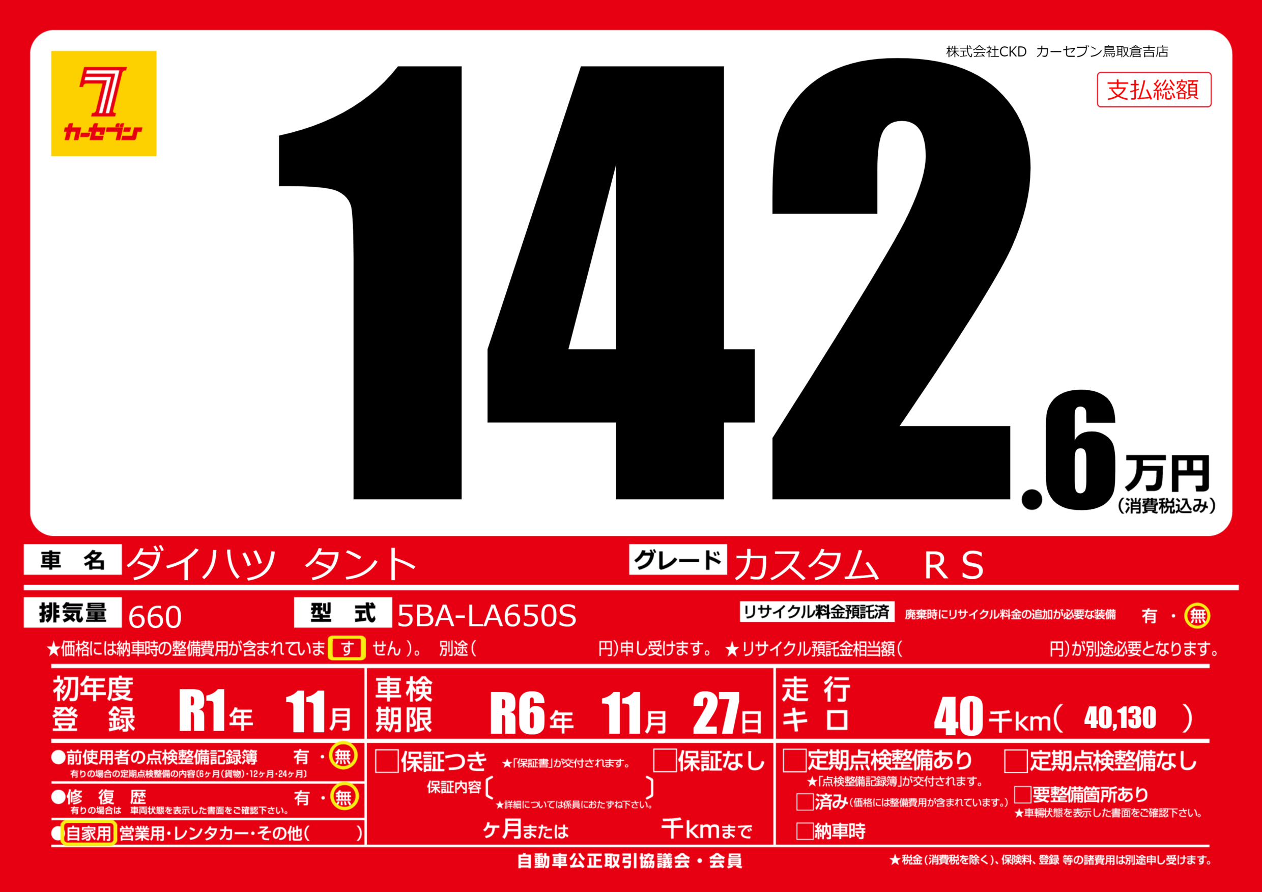 | 走行キロ | 4万km | 初年度登録 | R1年11月 |