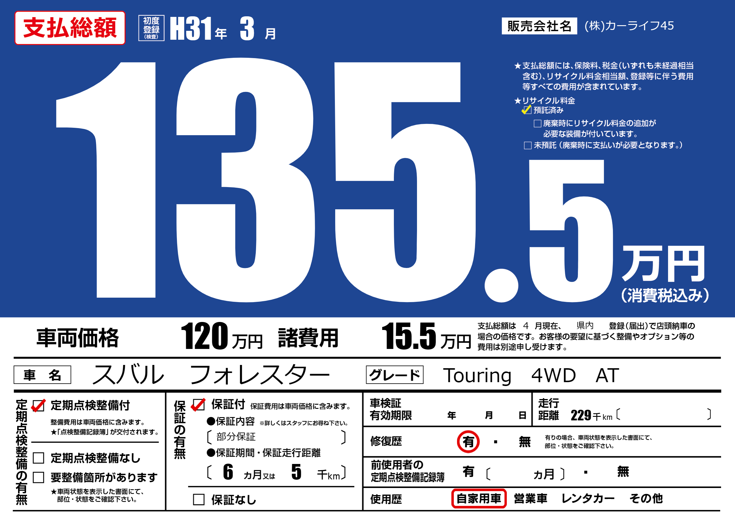 保証付き 保証内容(部分保証) 6ヶ月または(5)千kmまで |