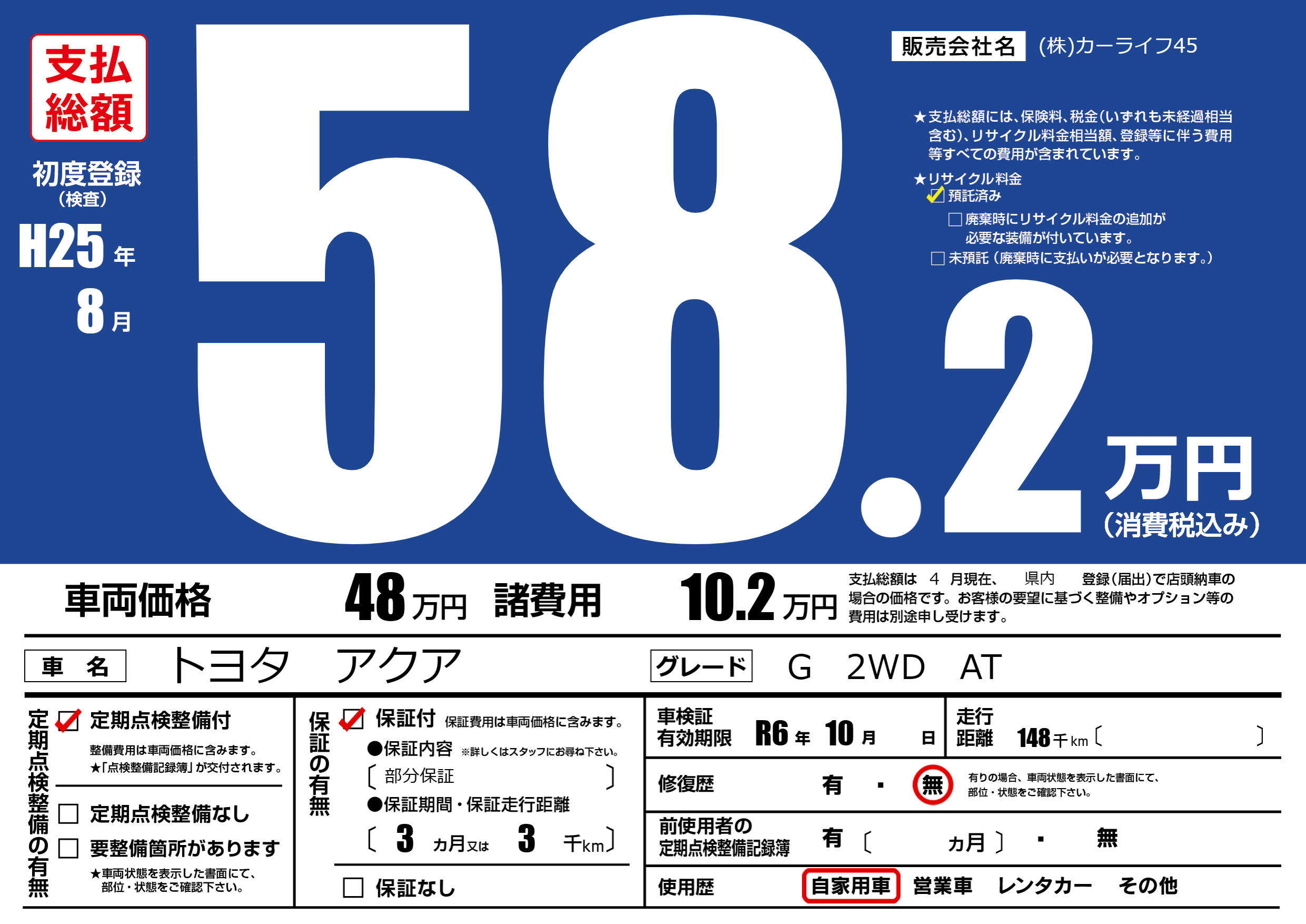 | 車検制限 | R6年 10月 - 日 | ||