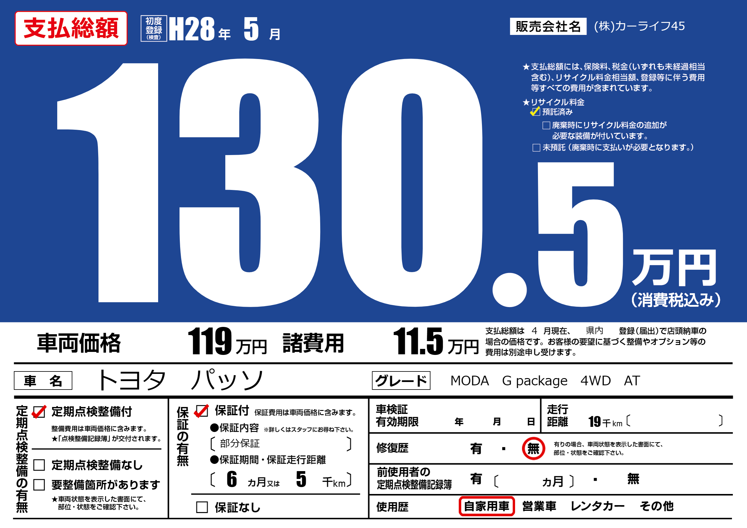| 車名 | トヨタ パッソ | グレード ミッション 排気量 |