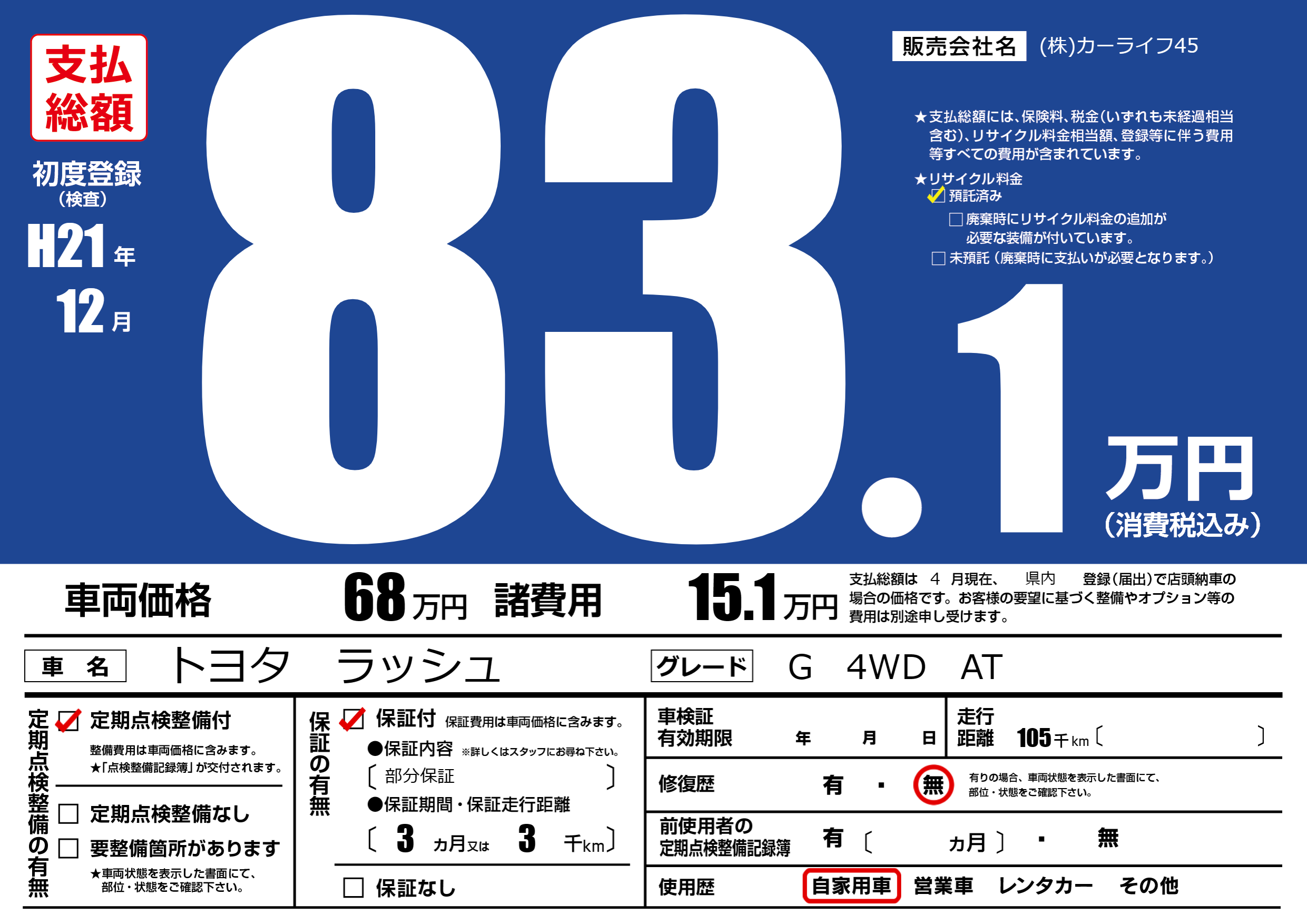 | 走行キロ | 10.5万km | 初年度登録 | H21年12月 |