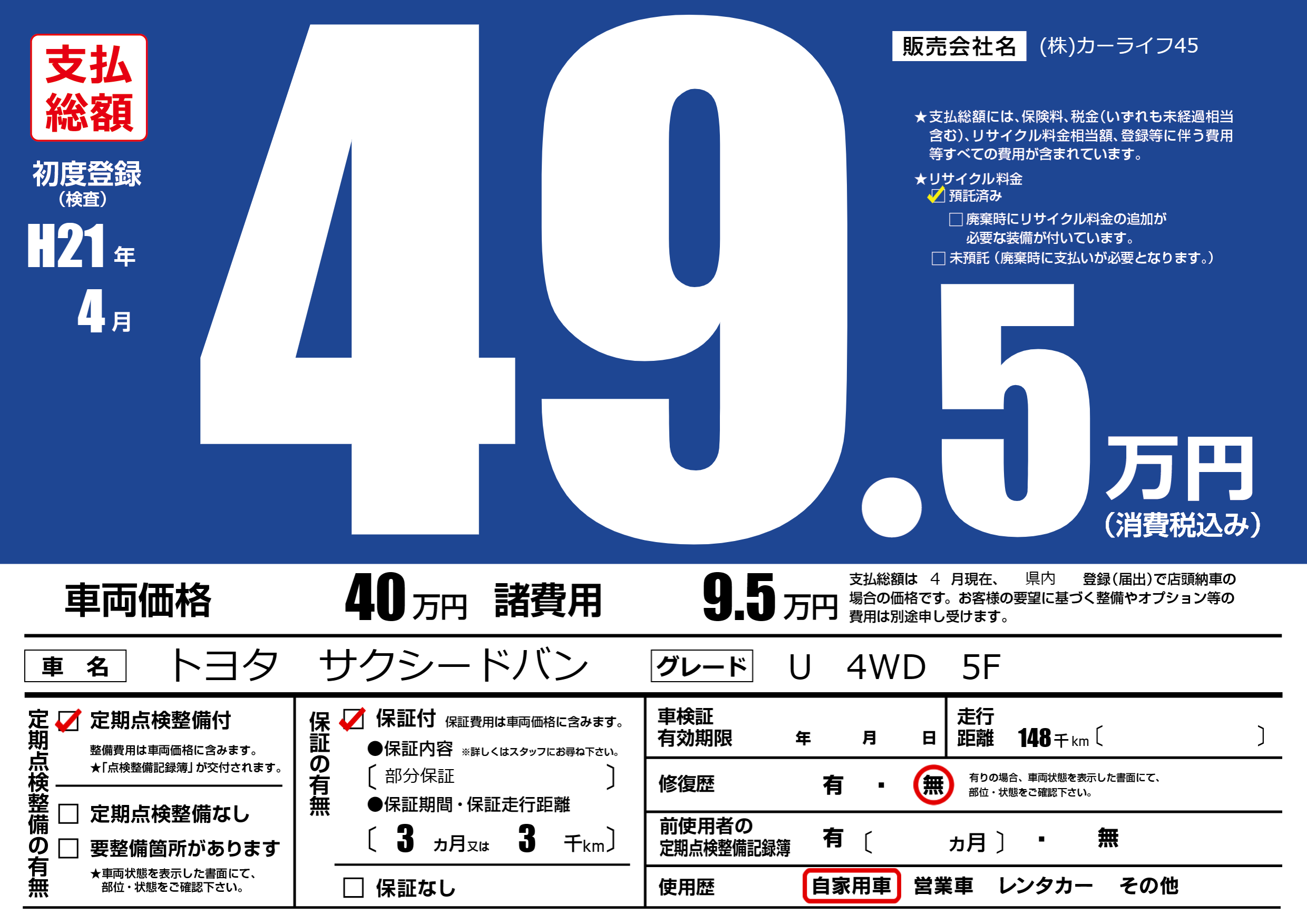 | 走行キロ | 14.8万km | 初年度登録 | H21年4月 |
