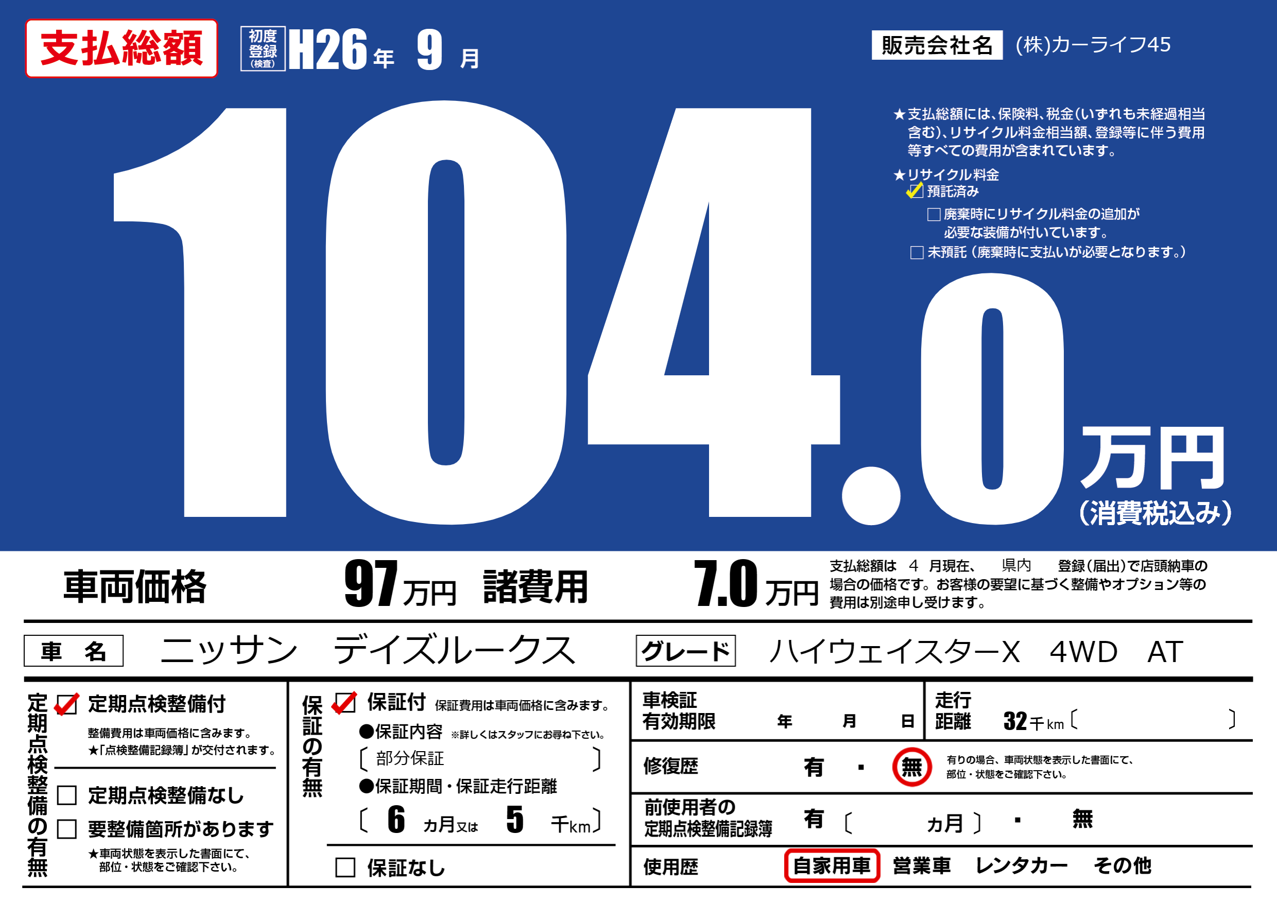 | 車名 | ニッサン デイズルークス | グレード ミッション 排気量 |