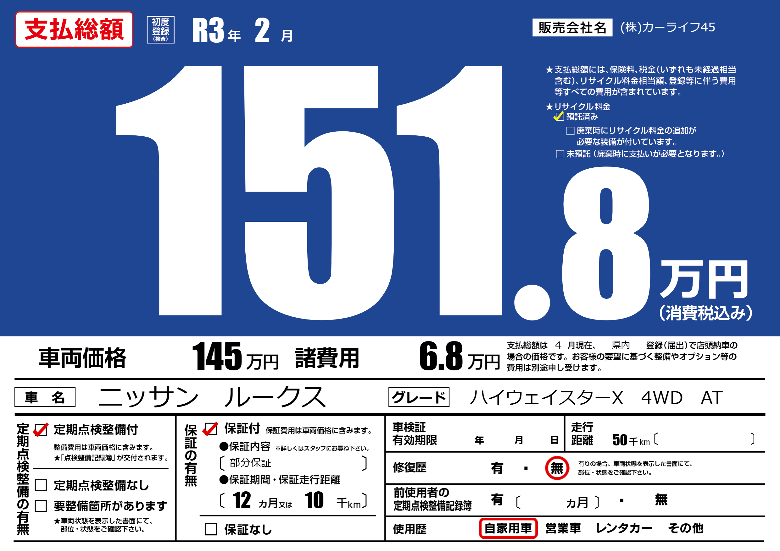 | 車名 | ニッサン ルークス | グレード ミッション 排気量 |