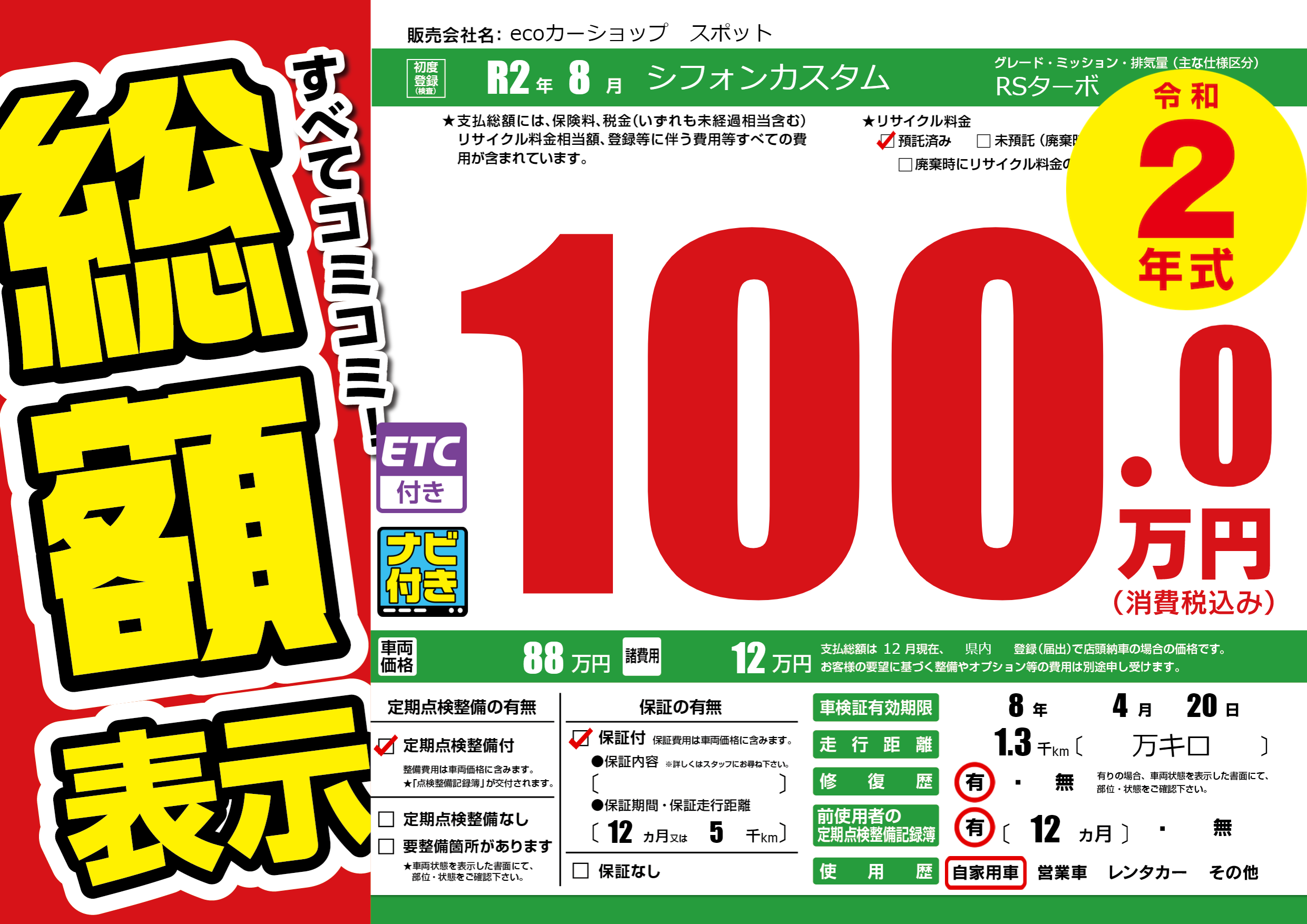 | 走行キロ | 0.1万km | 初年度登録 | R2年8月 |