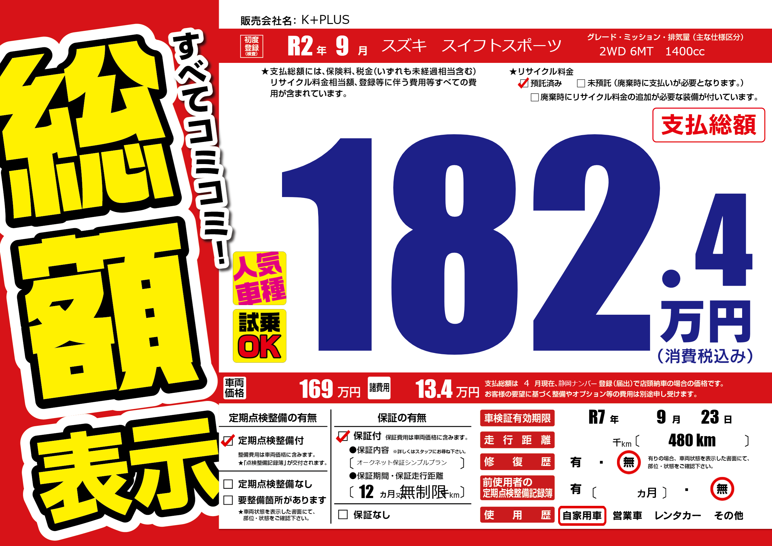 | 車名 | スズキ スイフトスポーツ | グレード ミッション 排気量 |