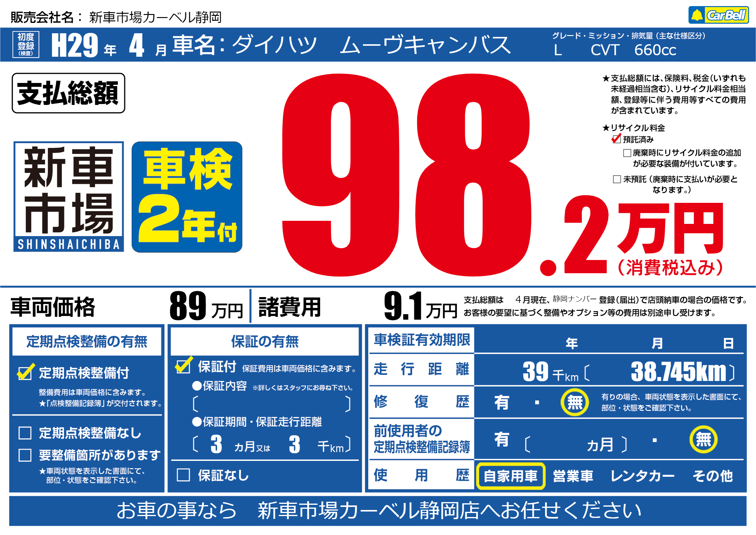 保証付き 保証内容(---) 3ヶ月または(3)千kmまで |