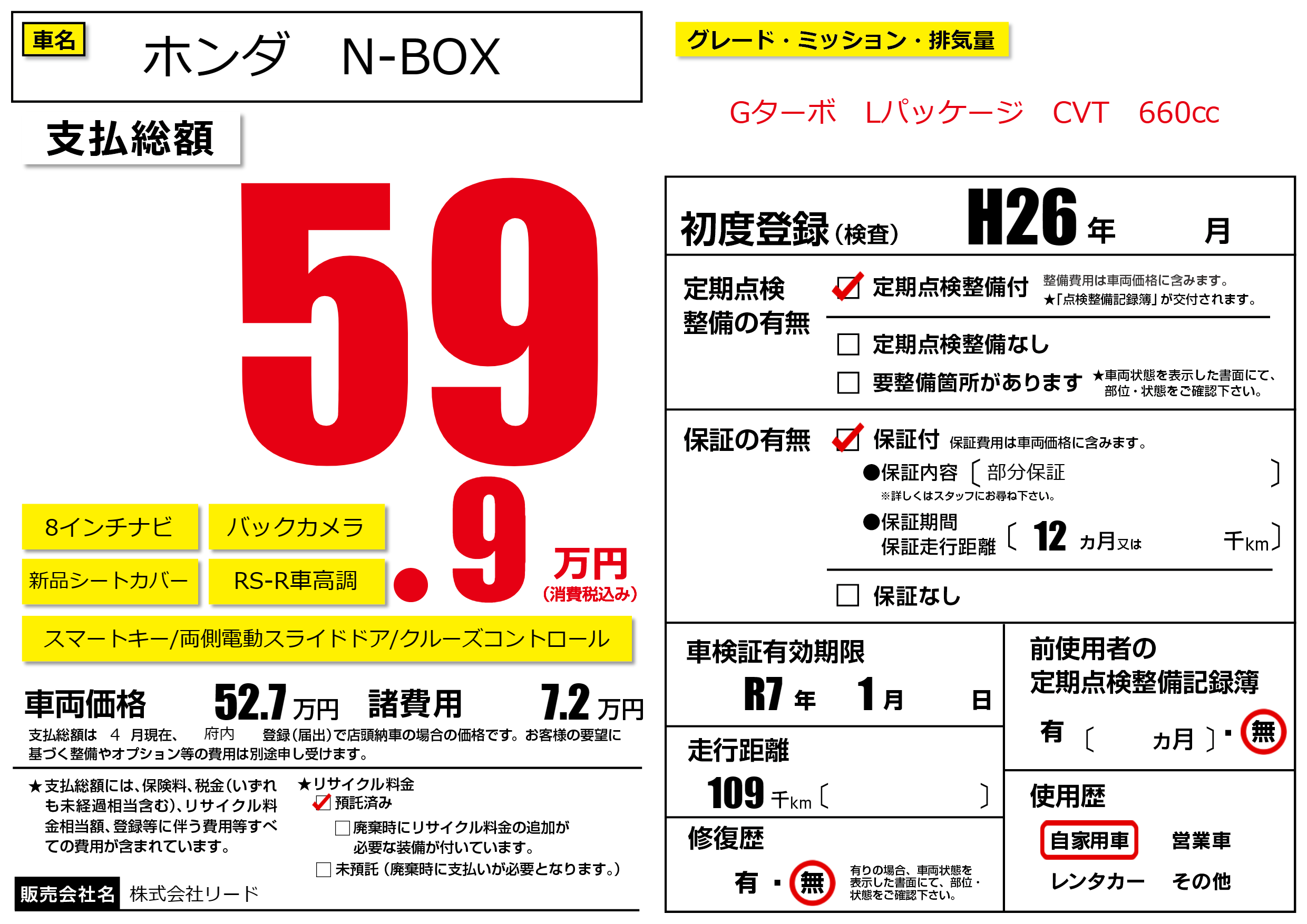 | 車名 | ホンダ N-BOX | グレード ミッション 排気量 |