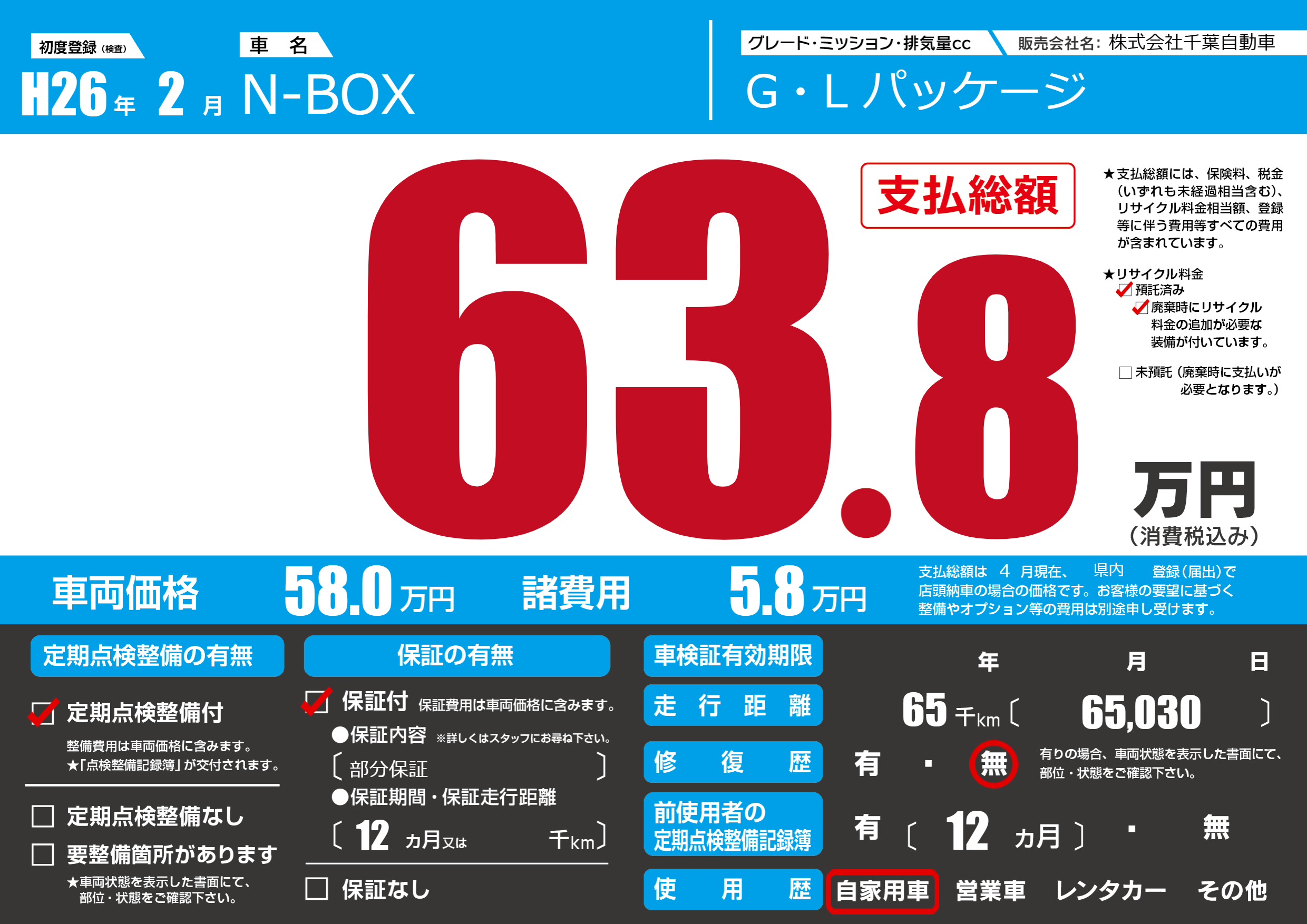 | 走行キロ | 6.5万km | 初年度登録 | H26年2月 |