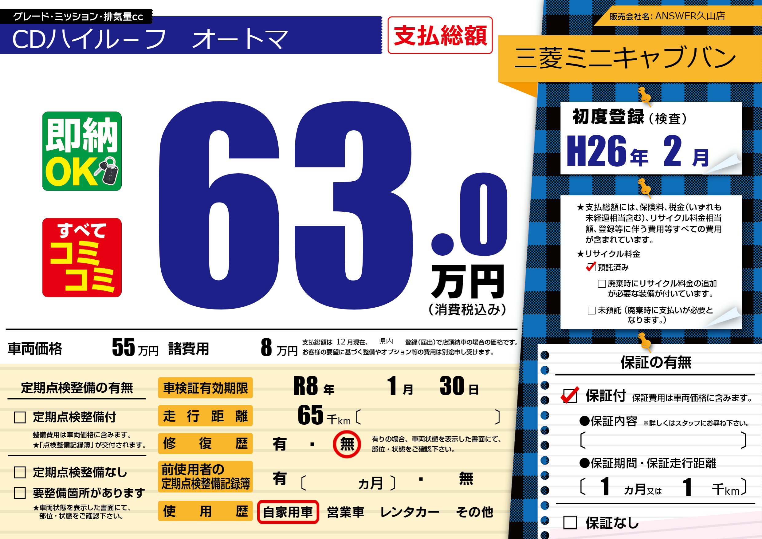 | 走行キロ | 6.5万km | 初年度登録 | H26年2月 |