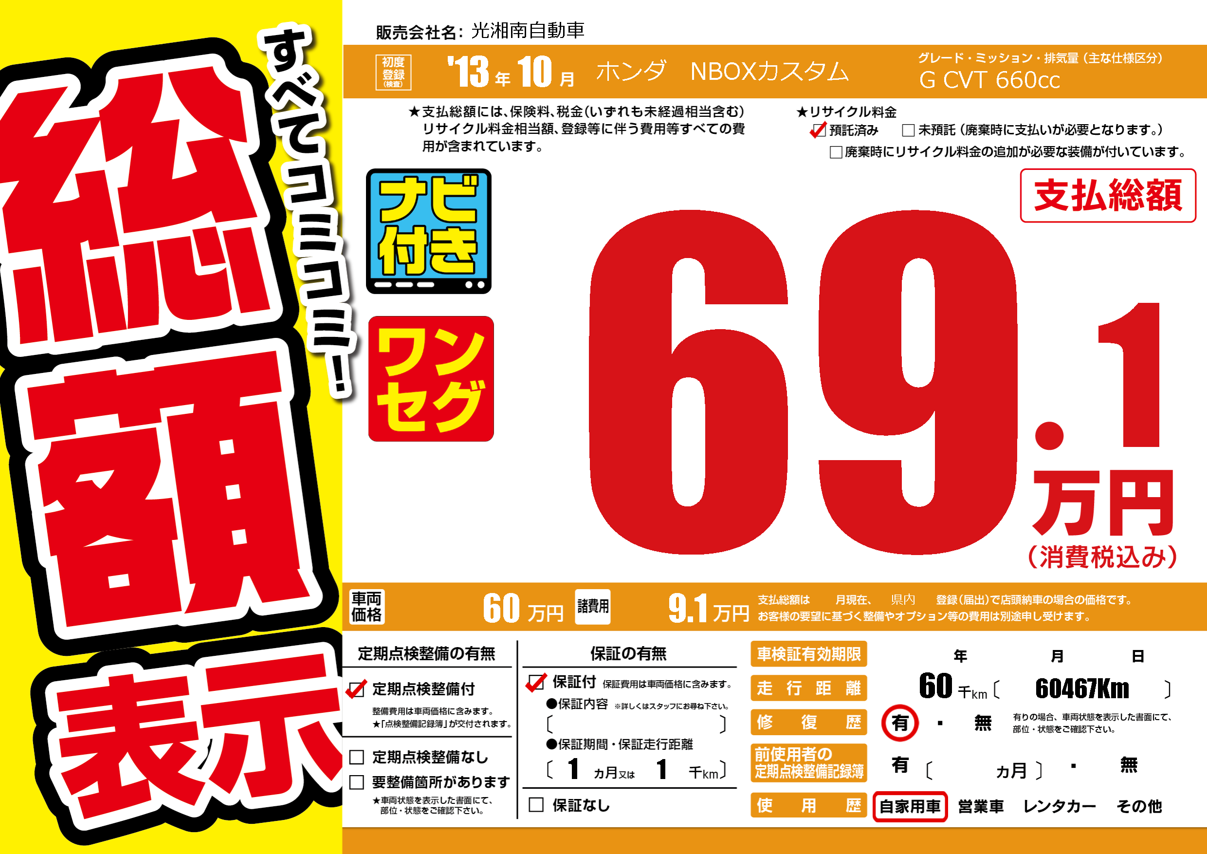 | 走行キロ | 6万km | 初年度登録 | '13年10月 |