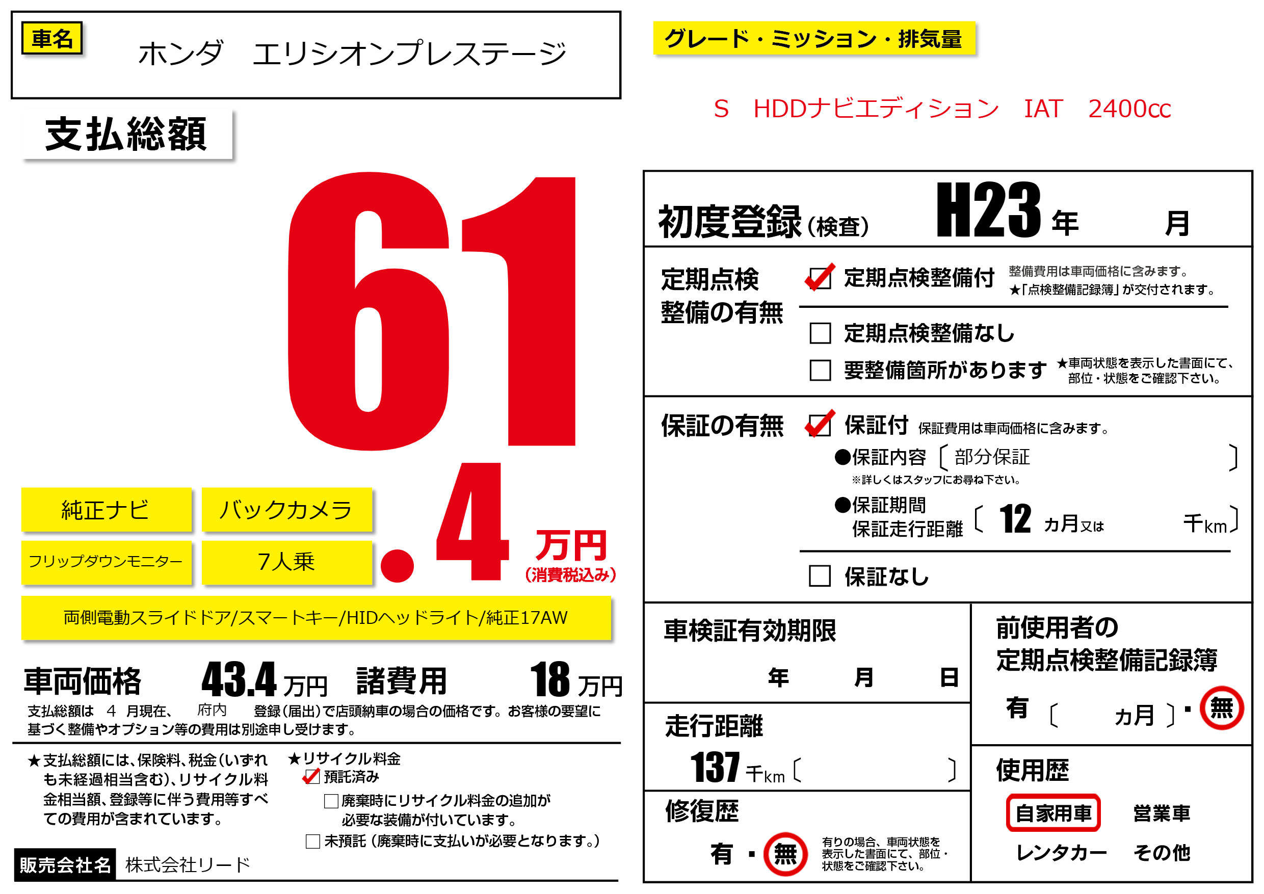 | 車名 | ホンダ エリシオンプレステージ | グレード ミッション 排気量 |